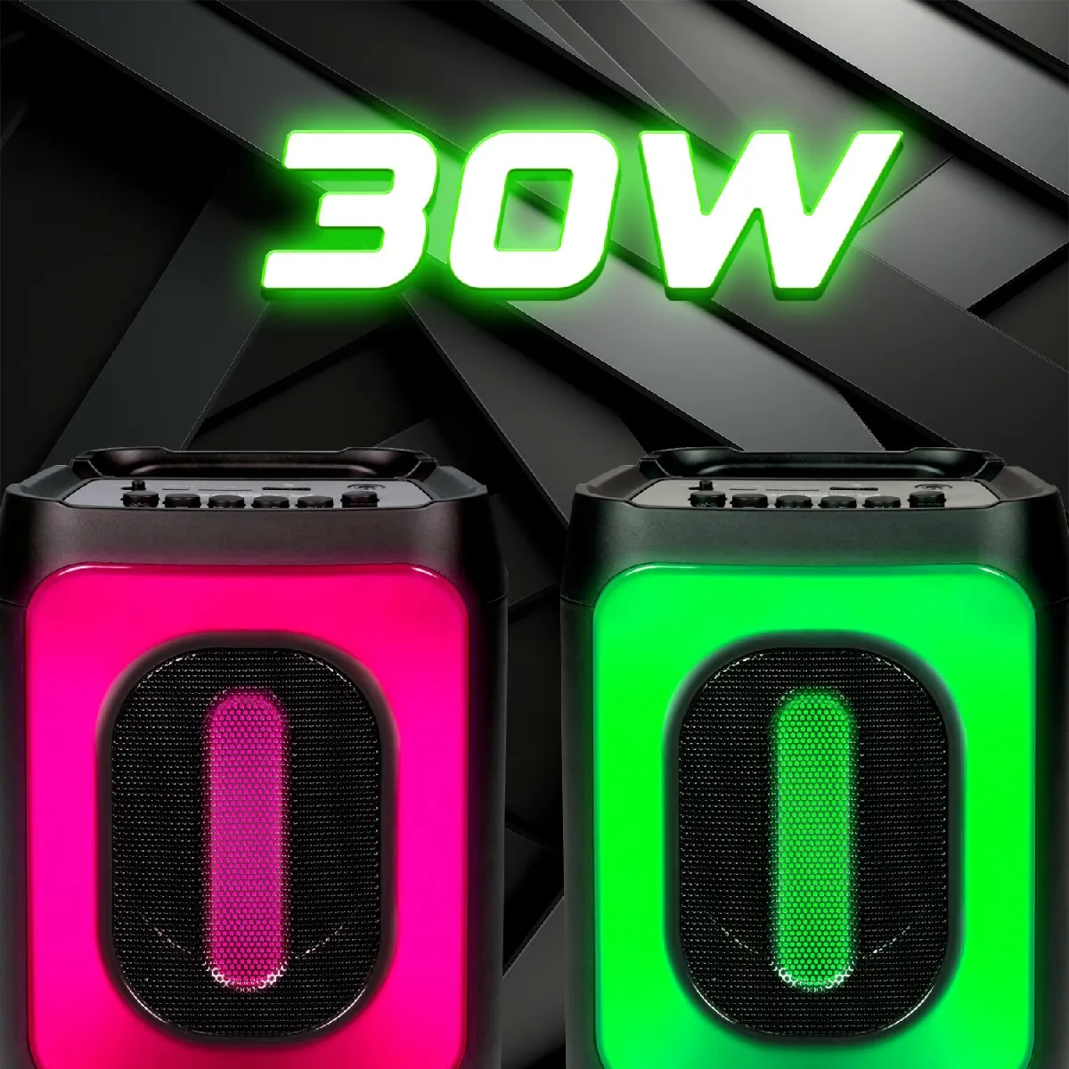 La musique s'invite partout avec une enceinte compacte qui combine format léger, puissance de 30 Watts et effets lumineux LED pour créer une ambiance immédiate. La connexion Bluetooth 5.0 stable et rapide facilite la lecture depuis un smartphone ou une tablette, tandis que la poignée intégrée simplifie chaque déplacement. Grâce à sa batterie rechargeable de 1800 mAh, elle accompagne des écoutes prolongées à la maison ou en extérieur. La prise micro 6,35 mm permet de transformer une réunion en session chant, et les modes de lecture USB et carte micro SD offrent des alternatives sans téléphone. L'option Bass Boost pour des graves renforcés complète une expérience conviviale.