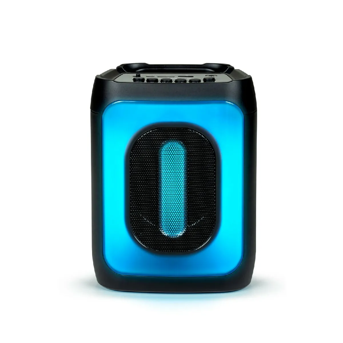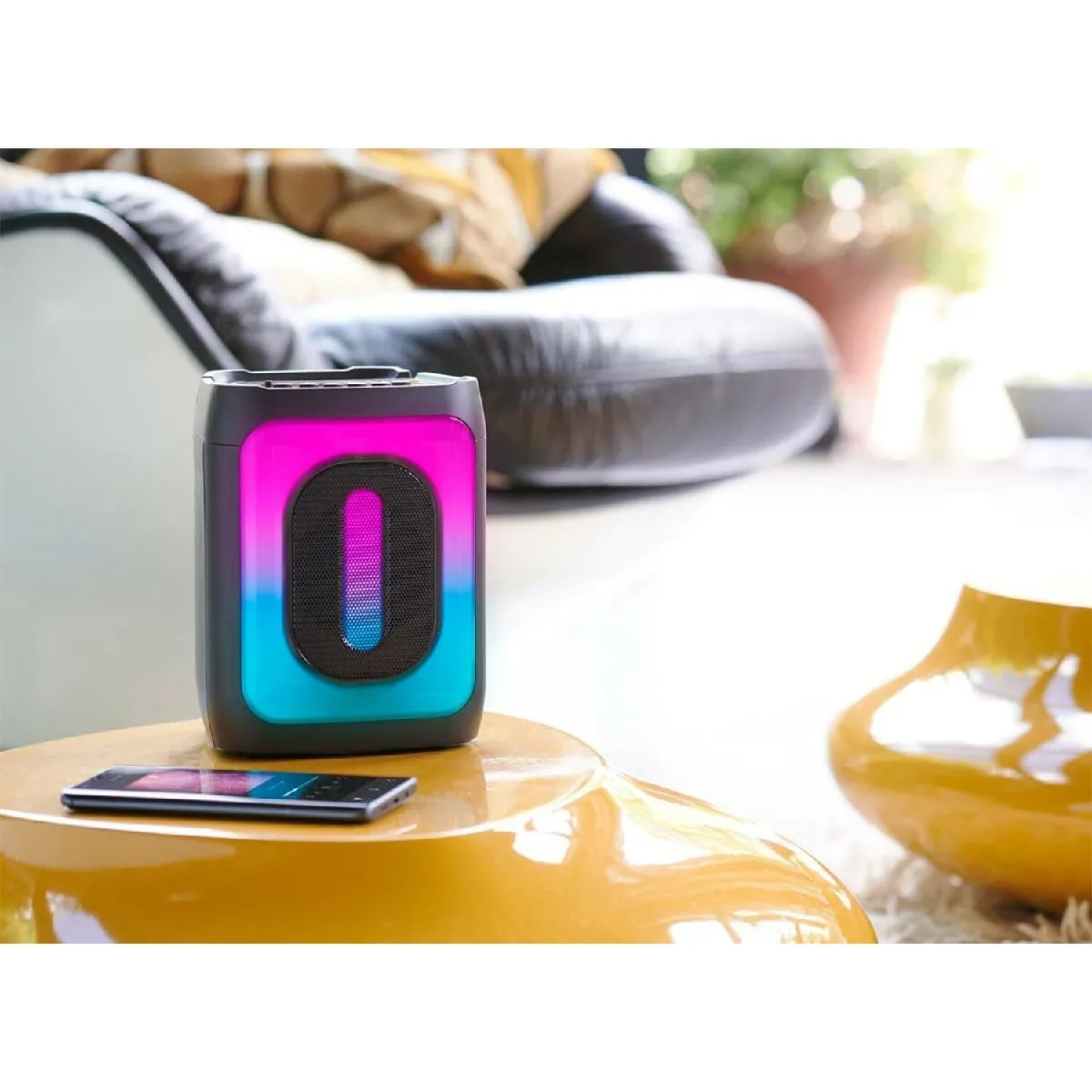 Pensée pour être emportée partout, cette enceinte ne pèse que 0.86 kg et intègre une poignée de transport pour une prise en main rapide. Sa batterie 1800 mAh rechargeable assure une écoute continue adaptée aux pauses musicales comme aux soirées entre amis. Les effets lumineux LED multiples ajoutent une touche visuelle qui accompagne le rythme, utile pour dynamiser un espace sans accessoires supplémentaires. Ses dimensions de 185 H x 130 P x 140 L mm facilitent le rangement dans un sac ou sur une étagère, tout en laissant assez de volume pour délivrer une puissance sonore de 30 Watts.