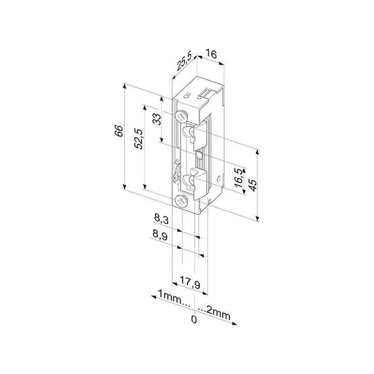 - Construction : gâche plate en inox, finition brossée, dimensions 25,5 x 16 x 66 mm