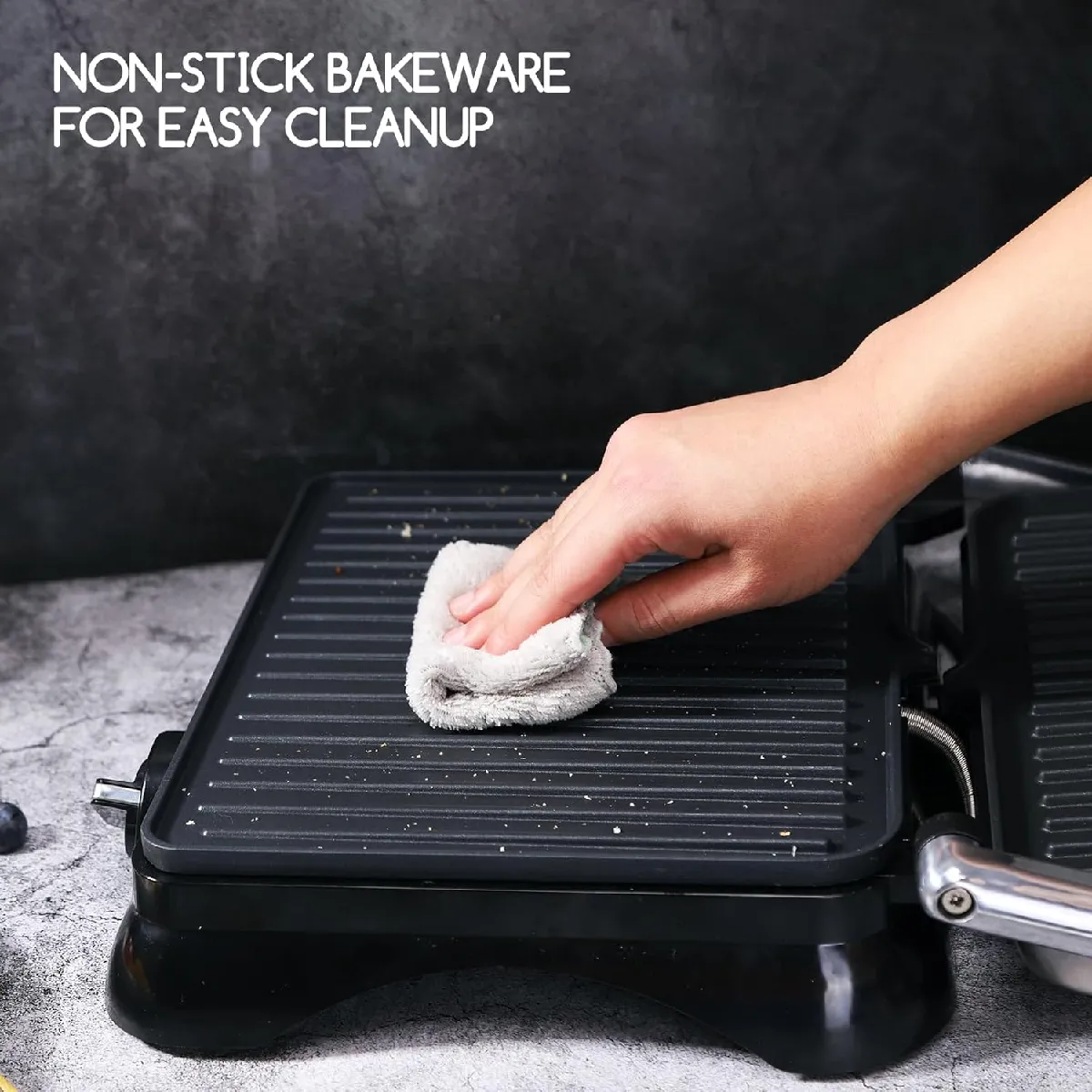 Le corps en inox apporte une finition soignée et une résistance adaptée à un usage fréquent. La poignée reste froide, ce qui facilite l'ouverture et la fermeture pendant la cuisson, y compris en mode presse pour les sandwichs. Grâce au format compact et à une hauteur de 12.9 cm, l'appareil s'intègre aisément sur le plan de travail. L'ouverture à plat à 180º transforme le couvercle en seconde zone de cuisson, offrant plus d'espace pour gérer plusieurs aliments en simultané sans encombrement supplémentaire.