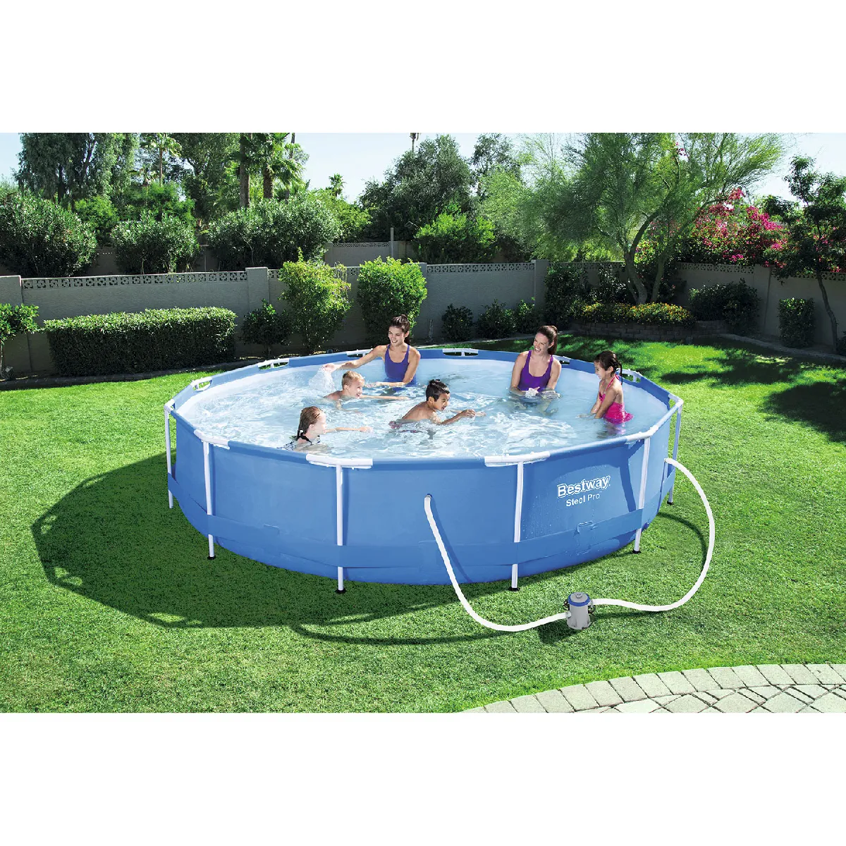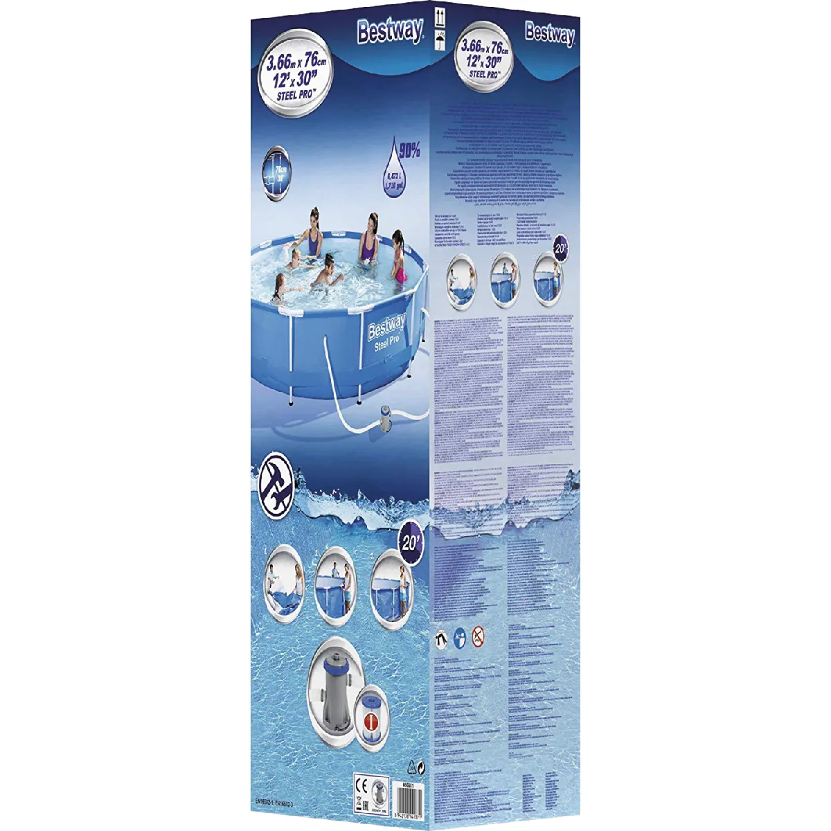 Cette piscine ronde à cadre Bestway a un diamètre de 366 cm et une hauteur de 76 cm. L'eau reste propre grâce à la pompe à filtre fournie, y compris la cartouche filtrante. La piscine hors-sol Bestway Steel Pro a un cadre rond en acier inoxydable et des parois en PVC et polyester resistant. Le montage de la piscine est rapide et facile. La piscine Bestway Steel Pro 305 x 76 cm avec pompe de filtration est livree sans marches. Avec une piscine Bestway Steel Pro, vous avez une belle piscine à un prix abordable.