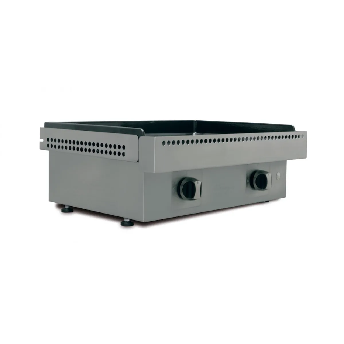 Les deux brûleurs totalisant 6 600 W alimentent quatre lignes de feu réparties sur l'ensemble de la plaque pour limiter les zones froides et obtenir des résultats constants. La plaque de 60 x 40 cm accueille simultanément plusieurs préparations, utiles pour gérer les cuissons par famille d'aliments. Avec un thermostat réglable, il est simple d'ajuster la température selon la recette, de la saisie rapide à la cuisson plus douce.
