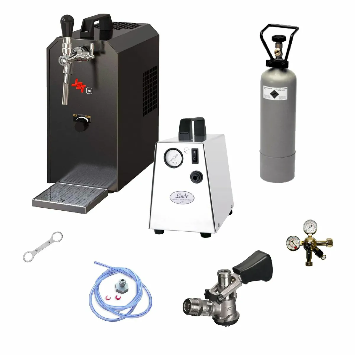 L'alimentation requise est de 230 V / 50 Hz, avec une puissance de 267 W. Le compresseur 1/8 PS assure la production de froid pour une stabilité de tirage sur une ligne. L'appareil est réfrigéré et dispose d'un bec de distribution. L'utilisation avec CO2 est prévue, avec réglage de pression au détendeur pour adapter le débit au type de bière. Le système accepte des fûts de 5 L via un adaptateur approprié, et le tuyau de bière se raccorde via des connecteurs à visser courants dans les installations de tirage.