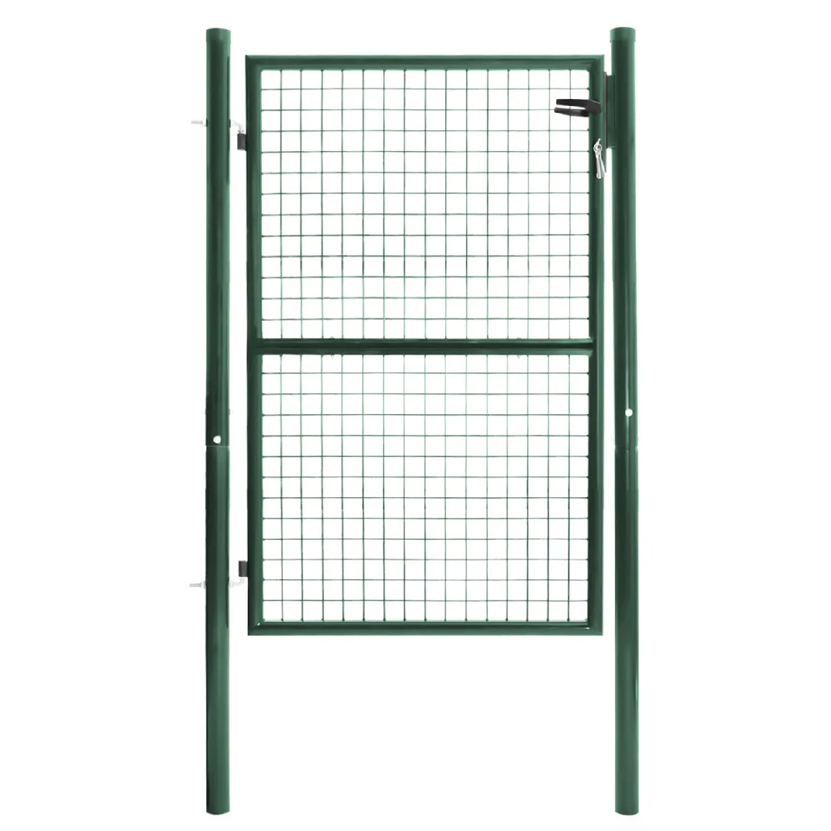 Son coloris vert classique et le design sobre et élégant s'intégreront harmonieusement à votre jardin. Il se fondra parfaitement dans le paysage tout en ajoutant une touche esthétique à votre extérieur.Idéal pour fermer une clôture résidentielle ou professionnelle. Très pratique, le portillon est équipé de deux poignées, une de chaque côté offrant un double sens d'ouverture pour une accessibilité optimale. La porte grillagée et la poignée avec serrure garantissent la sécurité de vos aménagements extérieurs. Le portillon de jardin peut être verrouillé à clé, et trois clés sont fournies pour une tranquillité d'esprit maximale. Livré avec un kit de visserie complet, le portillon est facile à installer. Il vous suffit de sceller les poteaux dans le sol et de fixer la porte et les poignées selon les instructions fournies.Les deux poteaux de 6 cm de diamètre à sceller solidement dans le sol assurent une stabilité maximale. Cela rend le portillon résistant même en cas de fortes intempéries ! Fabriqué en acier, le portillon est conçu pour résister aux conditions extérieures. Son revêtement antirouille garantit une longévité exceptionnelle. N'hésitez plus et laissez vous tenter par ce portillon en métal vert qui se fondra à merveille dans votre jardin ! Dimensions du portillon de jardinDimensions globales : Longueur 105 x Hauteur 175 cm Dimensions hors sol : L. 105 x H. 125 cm Dimensions de la porte : L. 87 x H. 125 cmDiamètre des tubes de la porte : 4 cmHauteur des poteaux : 175 cmDiamètre des poteaux : 6 cmDimensions des carreaux du grillage : L. 5 x H. 5 cmType de pose : scellement sur 50 cmMatériaux : AcierColoris : vertInclus : une poignée avec serrure, 3 clés, kit de visserie completÀ monter soi-même Retrouvez tous nos portillons de jardin sur notre boutique en ligne.