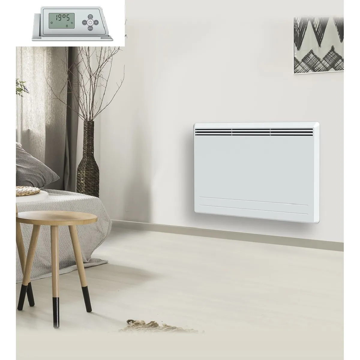 Le thermostat électronique avec affichage digital rend les réglages lisibles et reproductibles. Les commandes permettent d'adapter la chauffe à la pièce et aux habitudes, afin d'obtenir une température stable avec un pilotage simple. En veille, la consommation est indiquée comme très faible, ce qui optimise l'usage au quotidien. Le format plat et la largeur de 75 cm facilitent l'installation sur mur droit, tout en conservant une intégration discrète dans un espace de vie.