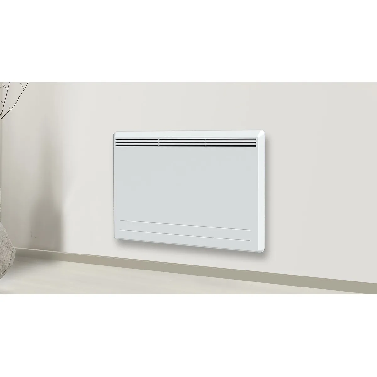 La pose s'effectue avec le support mural en H fourni pour un maintien fiable. La hauteur de 57 cm et le format horizontal aident à positionner l'appareil sous une fenêtre ou le long d'un mur. Le poids de 17 kg assure une stabilité une fois fixé avec le support adapté. L'interface à affichage digital rend la lecture des consignes intuitive et offre un réglage précis de la température souhaitée selon les moments de la journée.