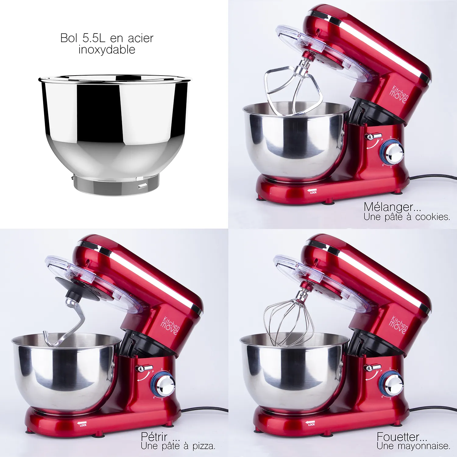 - Capacité du bol : 5,5 L, acier inoxydable