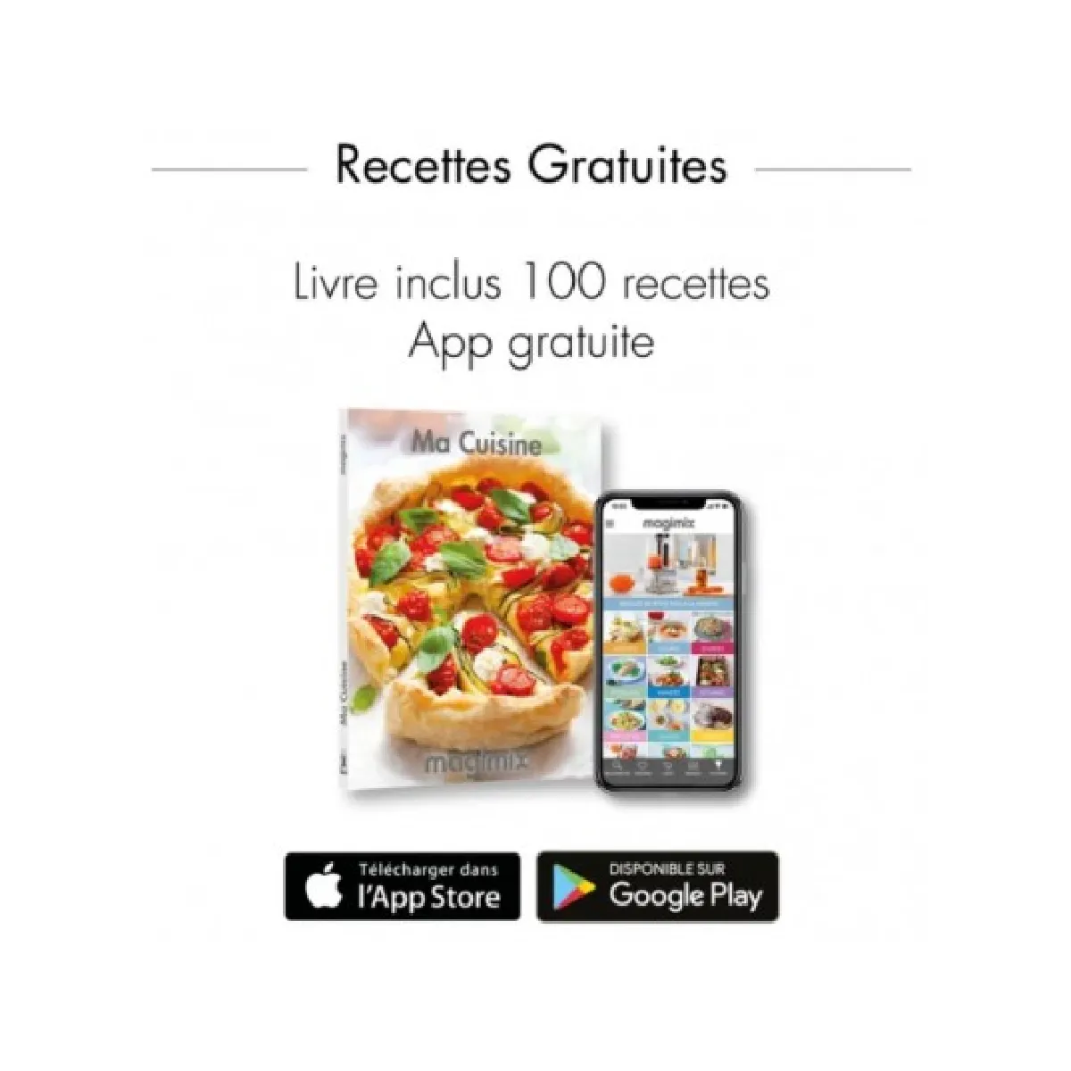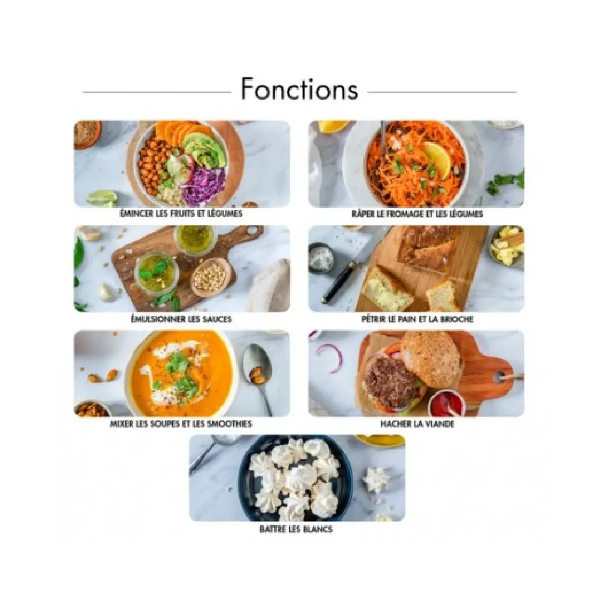 Nombre de bol(s): 3; Batteur, 4 disques, livre de recettes et spatule; Couteau, 4 disques, batteur, pétrin, presse agrumes, blendermix, boîte de rangement, livre de 100 recettes, spatule