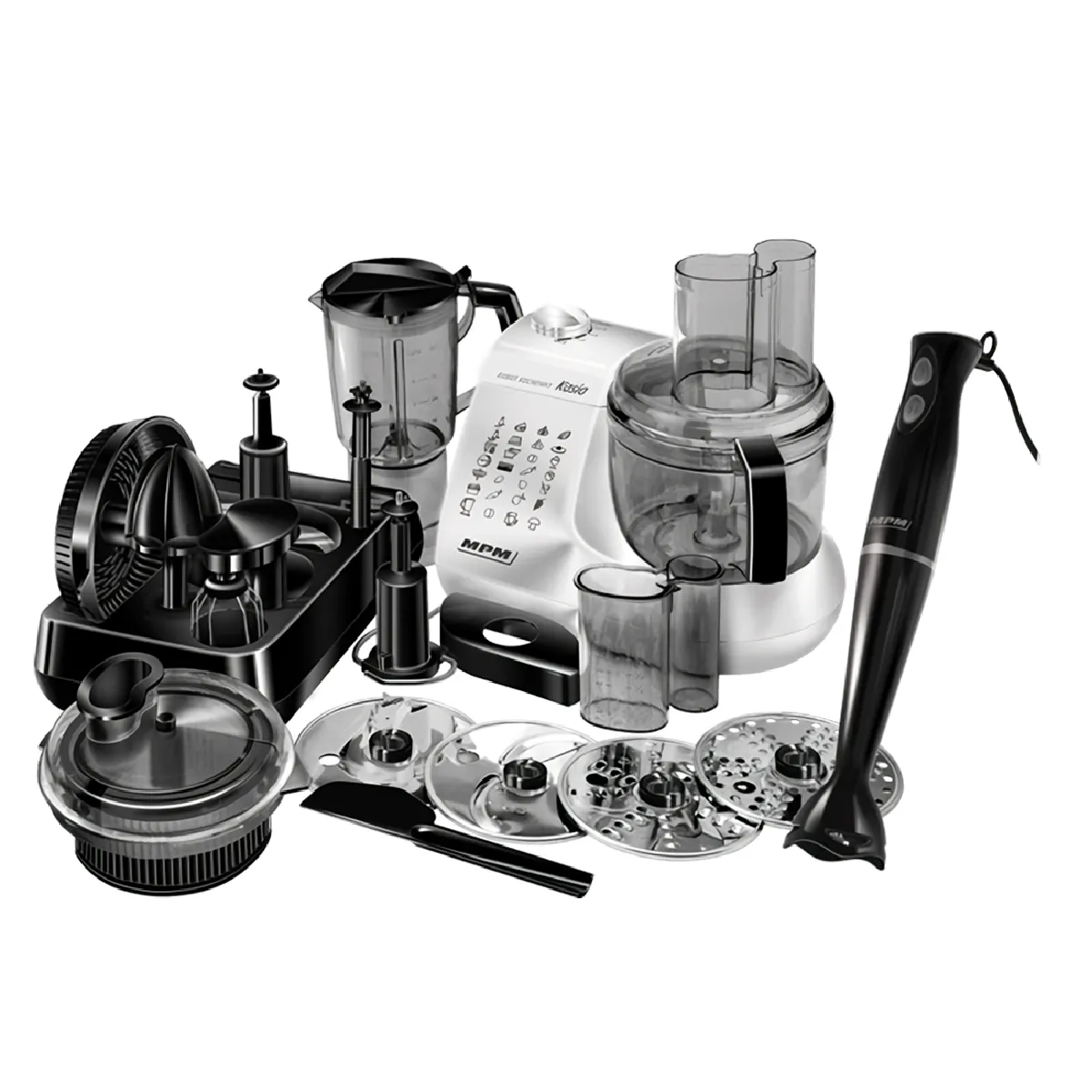 Le set comprend un bol à pétrir 1,5 L, un mélangeur 1 L, un pétrisseur, un batteur, un presse-agrumes, 4 disques de coupe/mélange et un accessoire hachoir à lames inox.