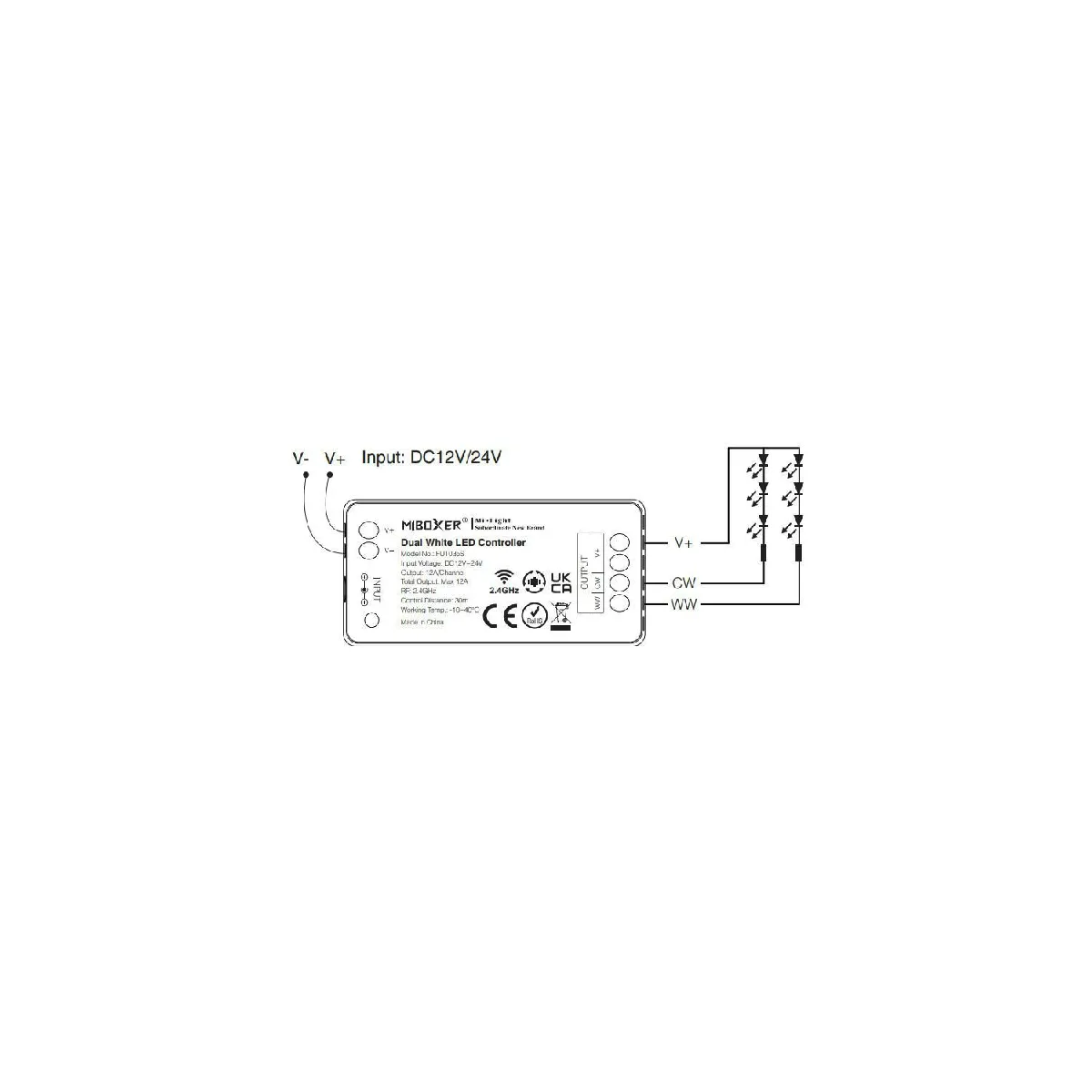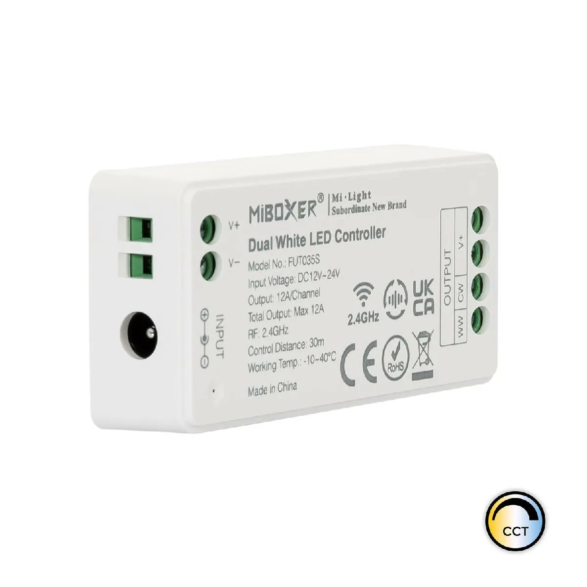 Son boîtier en PC haute résistance au format extra plat s'intègre facilement. L'installation se fait en 12-24 V DC via connecteur jack ou par raccordement direct aux bornes V+/V-. Le courant de sortie de 12 A répond aux exigences courantes des rubans LED compatibles. Le contrôleur fonctionne avec les télécommandes RF MiBoxer mentionnées par le fabricant, offrant un réglage fluide du blanc chaud au blanc froid et une gradation stable pour un confort visuel adapté à chaque usage.