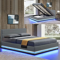 Lit LED avec coffre de rangement - Sommier à lattes en peuplier - Éclairage LED intégré - Revêtement en simili cuir