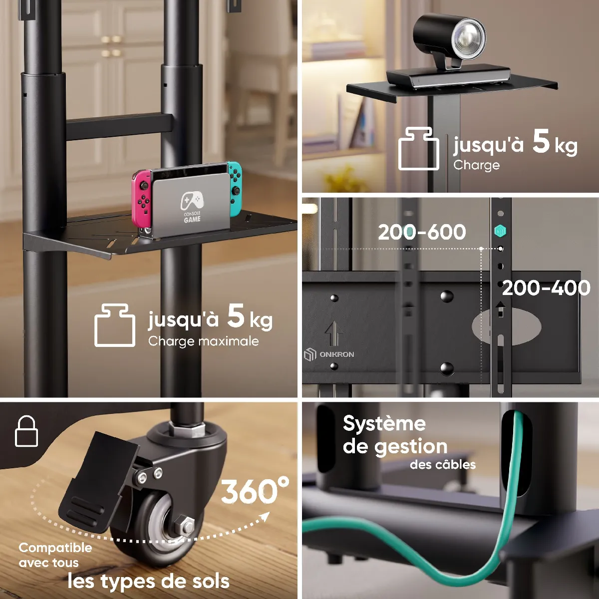 SUPPORT TV SUR PIED AVEC ROULETTES | ONKRON TS1571-B est un meuble TV roulette pour les TVs & panneaux interactifs de 32 - 75 pouces | Ecran mobile sur pied peut supporter un poids jusqu'à 50 kg | Chariot mobile TV est compatible avec VESA 200x200 - VESA 600x400 mm | Meuble TV à roulettes est réglable en hauteur de 1000-1465 mm