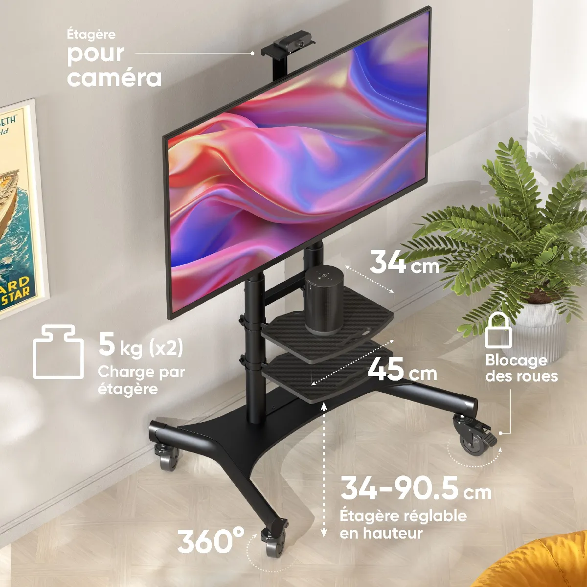 MEUBLE TV SUR ROULETTES |Ecran geant sur roulette a deux étagères plastiques réglables en hauteur | Chacune etagere TV peut supporter jusqu'à 5 kg, où vous pouvez poser vos techniques supplémentaires| Aussi le support pied TV roulette a une étagère supérieure pour une caméra PTZ ou webcam | La base large et le matériau solide du chariot mobile TV assurent la sécurité maximale