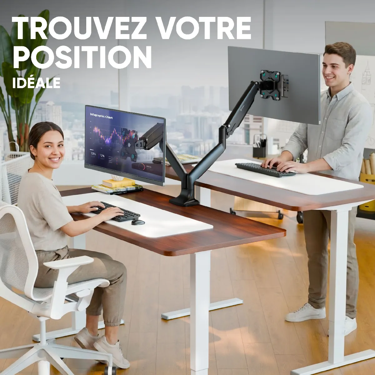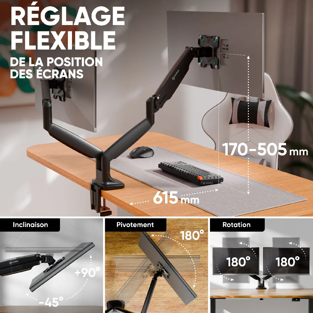 SUPPORT 2 ECRAN PC & TV | Bras articulé ecran PC peut s'incliner de -90°~+45° | Support écran double pivote à gauche et à droite jusqu'à 180° et est rotatif à 360° | Double bras ecran PC est hauteur réglable de 170 - 505 mm | Bras pour ecran PC double sera très pratique pour les graphistes, programmeurs et streamers comme un support ecran gaming, ainsi que pour un usage domestique