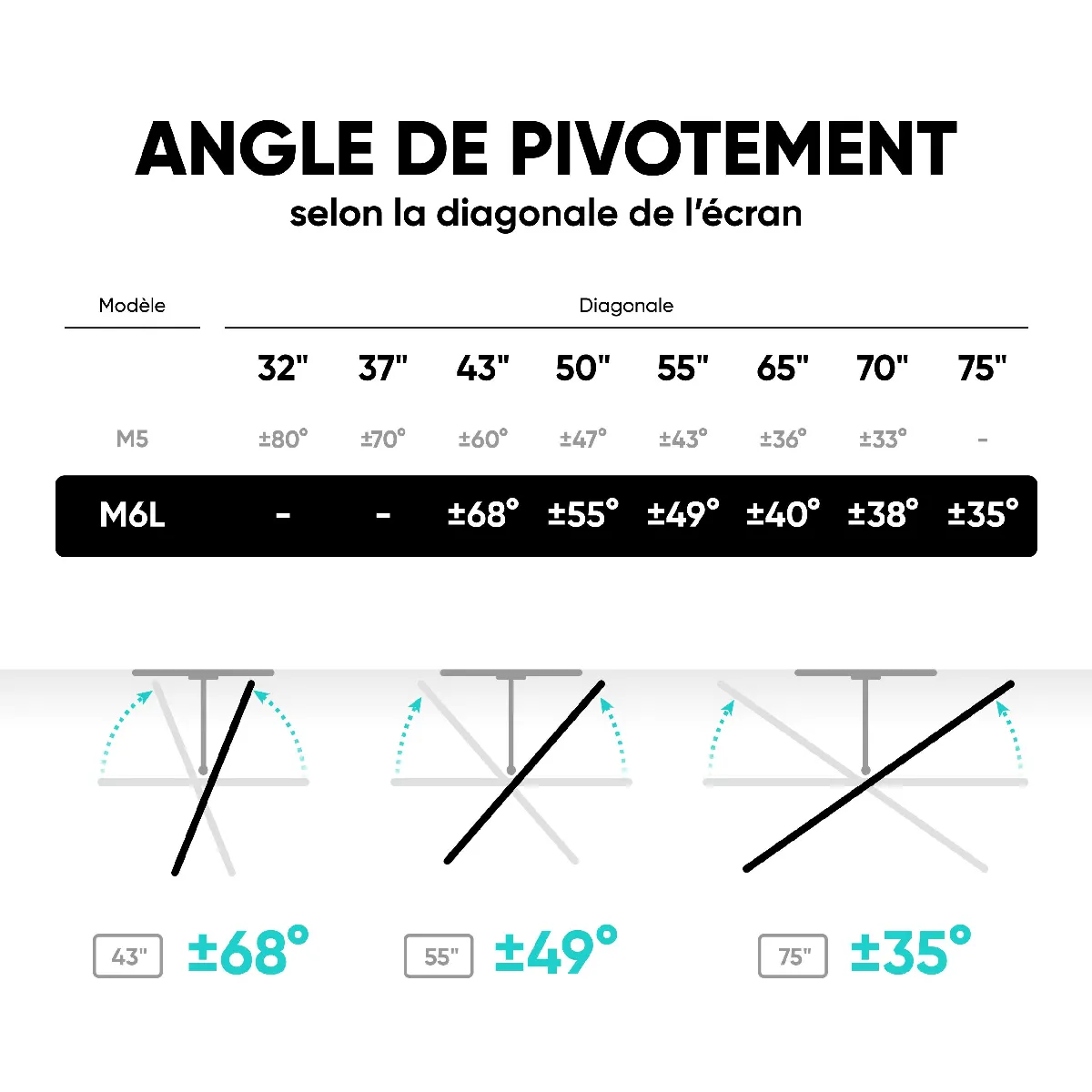 Support mural TV inclinable pivotant 40 - 75" - Poids max 45.5 kg - VESA 200x100 à 600x400 mm