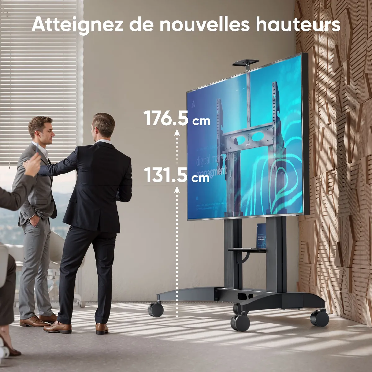 MEUBLE TELE ROULETTE | Utilisez le support pied TV sur roulette avec grands TVs & panneaux interactifs | Ecran geant sur roulette est un partenaire incontournable dans les écoles, les bureaux et les espaces clients | Placez une unité centrale sur la large base du support tele sur pied roulette et le transformez en un ordinateur portable sur roulettes à part entière