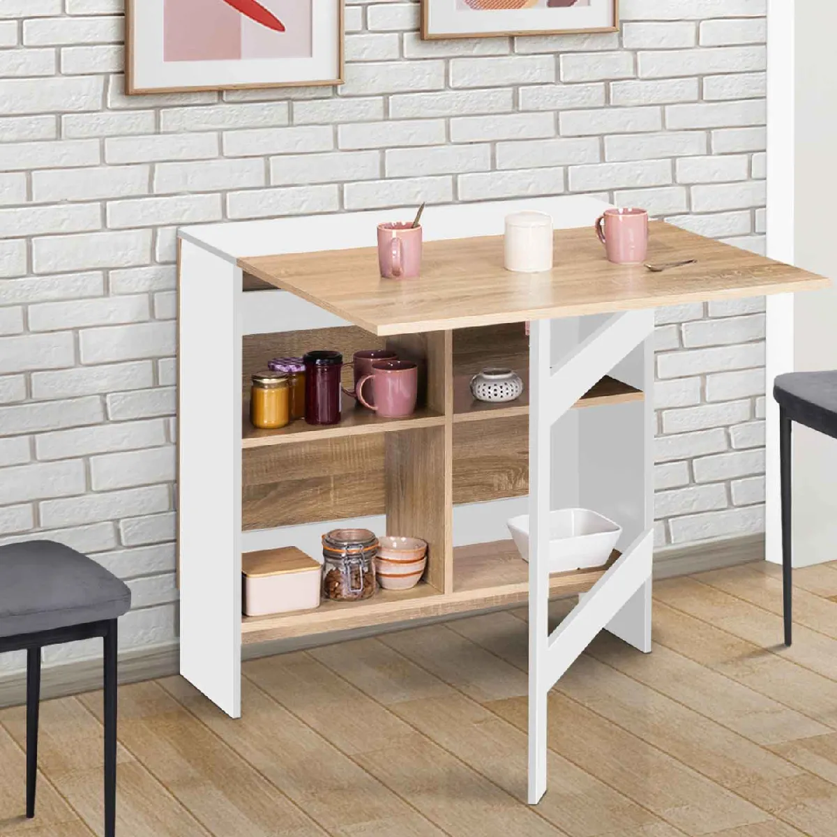 Table console pliable - Bois blanc - Multifonction - 2 à 6 personnes - Rangement intégré