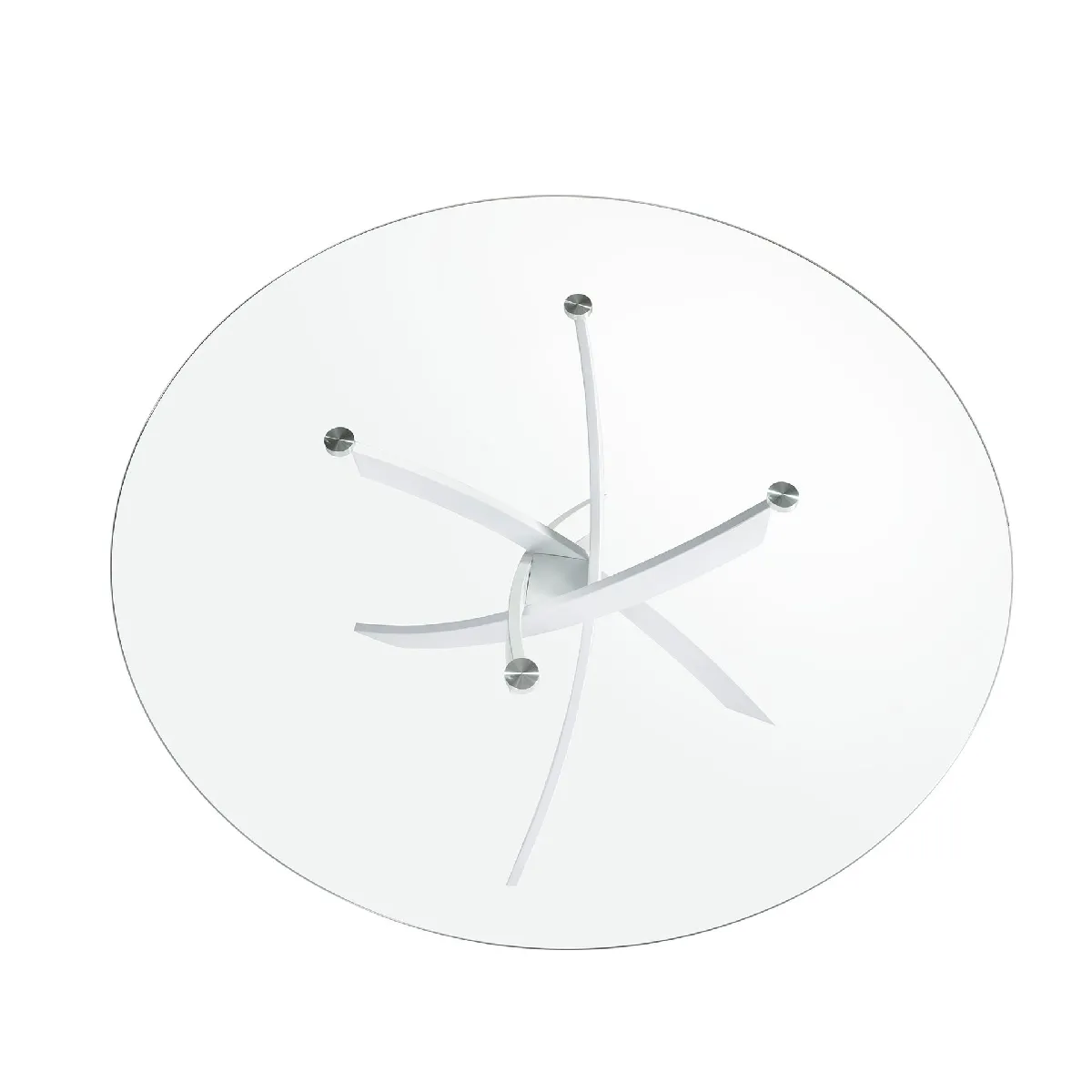 Table de salle à manger moderne ronde avec plateau fixe en verre trempé. Ses pieds originaux en acier peint en blanc sont des éléments clés pour mettre en valeur son design.