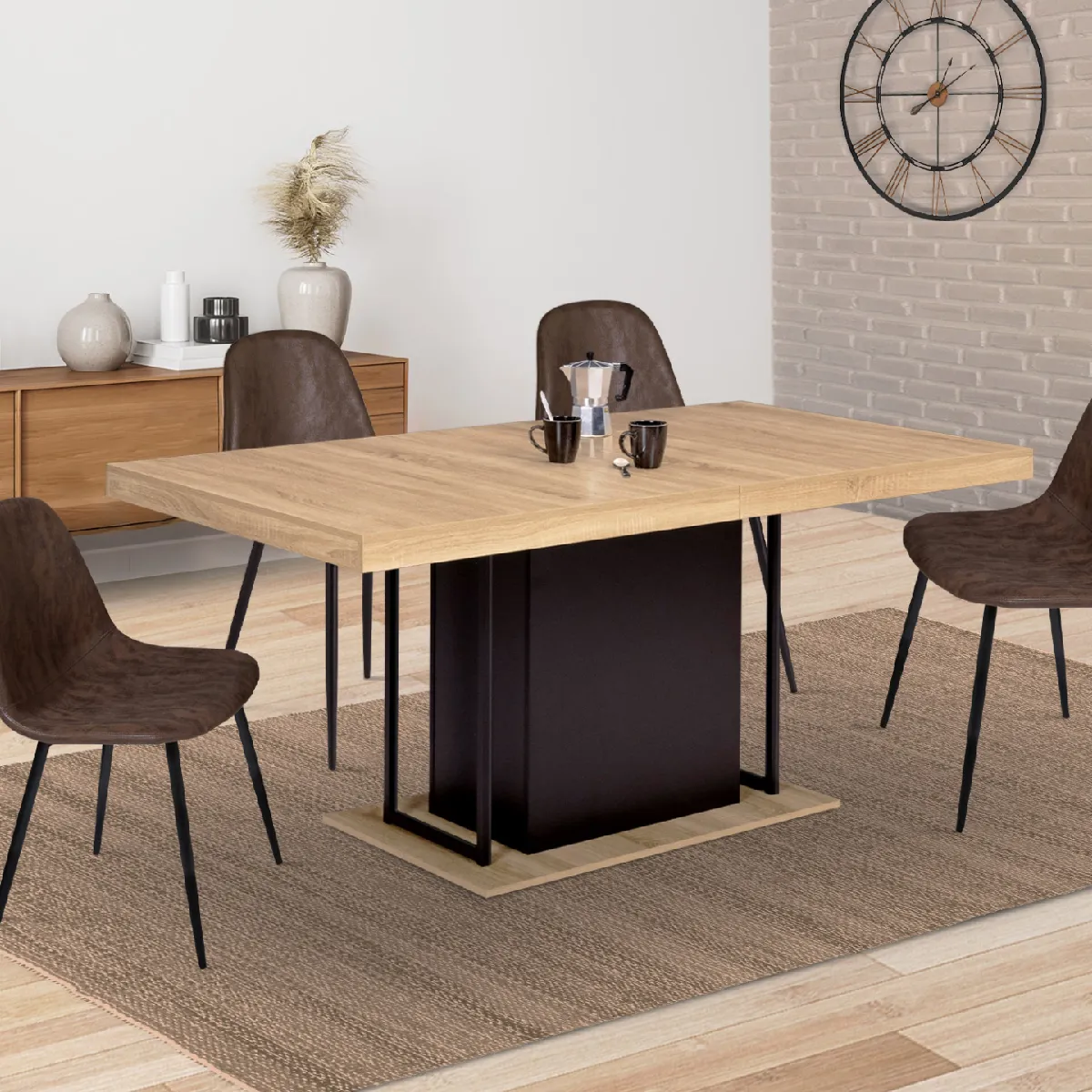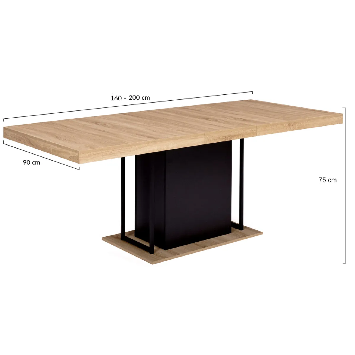 Découvrez notre table à manger extensible UGO au coloris bois et noir 160-200 cm, un bijou de design moderne et industriel qui ajoutera une touche d'élégance à votre espace de repas. Cette table, d'une longueur initiale de 160 cm, offre une solution ingénieuse pour accueillir vos convives grâce à une rallonge dissimulée dans le plateau. En quelques instants, vous pouvez étendre la table à une longueur de 200 cm offrant suffisamment d'espace pour 10 personnes. Le plateau doté d'un rebord de 6,5 cm de hauteur effet bois de hêtre apporte à cette table un aspect massif et une touche d'authenticité. Le mariage du bois et du noir créé un contraste élégant, tandis que le large piétement central avec ses barres en métal lui confère robustesse et style industriel.Fabriquée en panneaux de particules de 1,5 cm, cette table à manger UGO 6-10 personnes allie esthétique et durabilité. Elle s'intégrera parfaitement dans votre espace de vie tout en vous offrant la capacité de recevoir de nombreux invités. N'hésitez plus et profitez de repas conviviaux autour de cette superbe table à manger extensible UGO effet bois et noir, qui saura impressionner vos invités à coup sûr ! Dimensions de la table à manger extensible UGO 6-10 personnes Dimensions globales : Longueur 160 cm x largeur 90 cm x Hauteur 75 cmDimensions globales avec l'extension : Longueur 200 cm x largeur 90 cm x Hauteur 75 cmMatériaux : panneaux de particules mélaminés 1,5 cm et tubes en métal 2,0 x 2,0 cmÉpaisseur du plateau bois : 1,5 cm Hauteur des rebords du plateau : 6,5 cmDimensions du pied central : 52,5 cm x 32 cmDimensions du socle : 86 cm x 54,6 cmCouleurs : bois et noirCapacité : jusqu'à 10 convivesÀ monter soi-même Retrouvez toutes nos tables à manger disponibles sur notre boutique en ligne !
