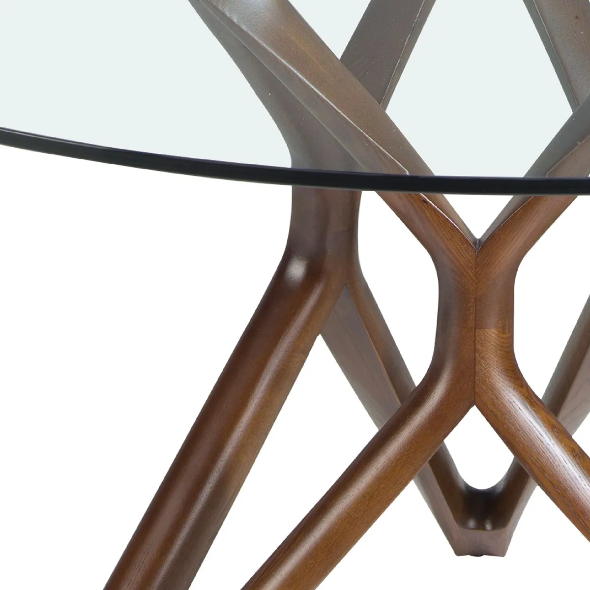 Table de salle à manger moderne ronde avec plateau fixe en verre trempé. Ses pieds originaux en bois couleur noyer sont des éléments clés pour souligner son design.