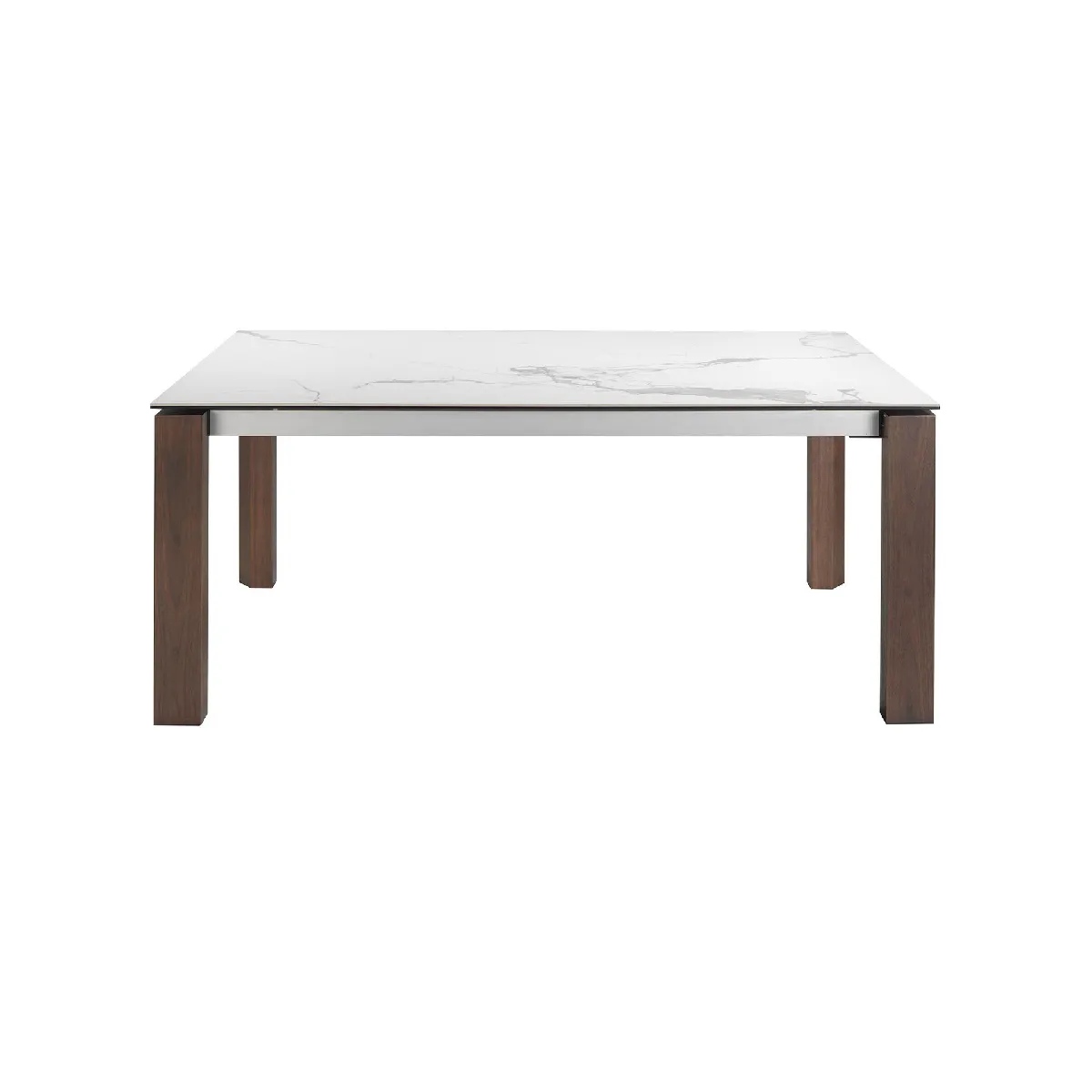Table de salle à manger rectangulaire extensible au design moderne avec plateau en marbre de porcelaine. Ses pieds en bois plaqué noyer naturel et son adaptabilité en font un meuble fonctionnel et polyvalent pour un usage quotidien.