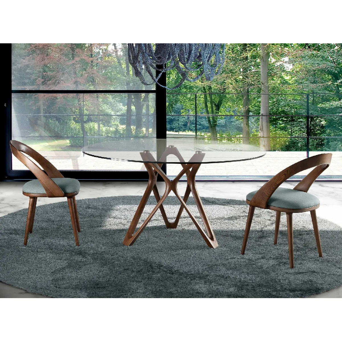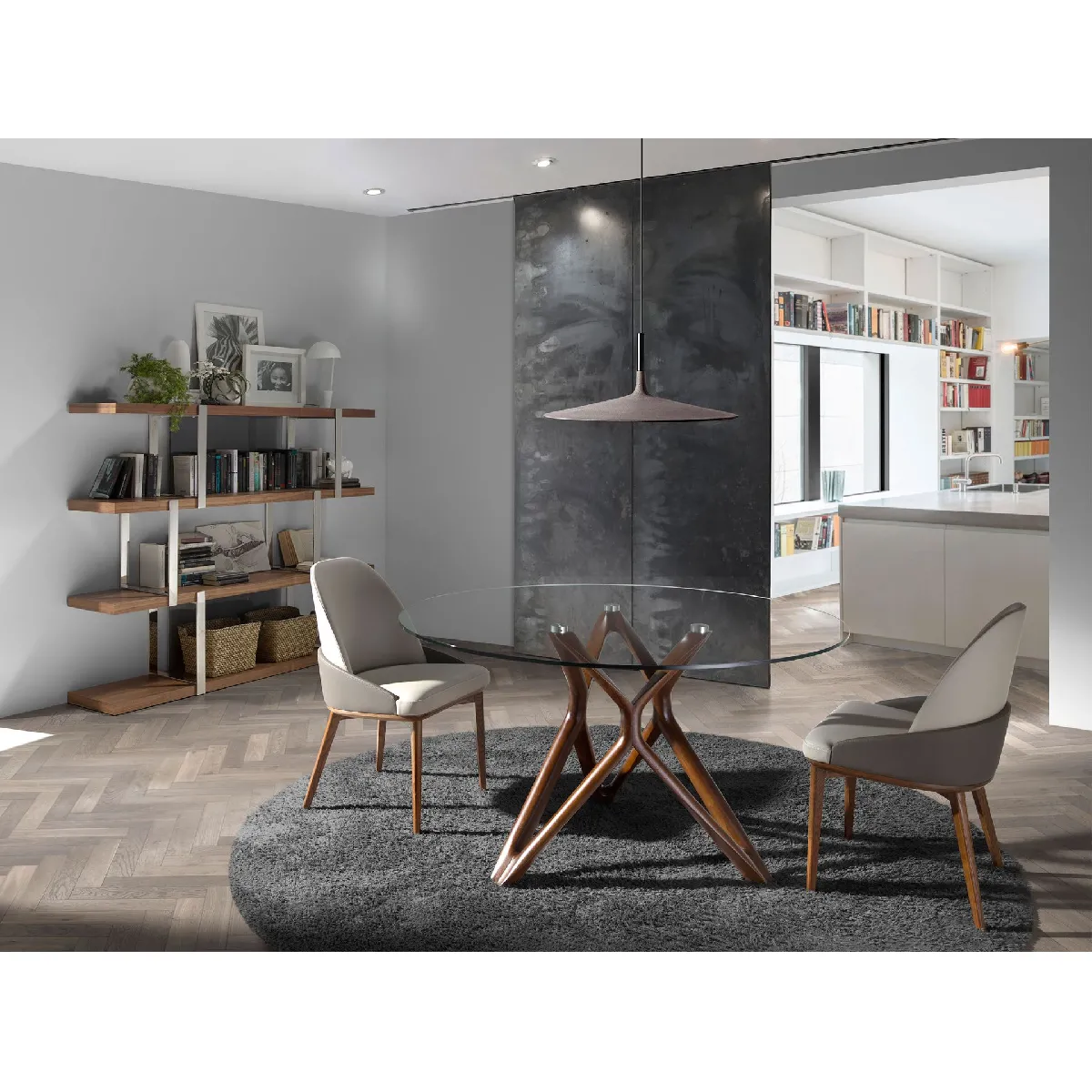 Table de salle à manger ronde moderne avec plateau fixe en verre trempé. Ses pieds originaux en bois couleur noyer sont des éléments clés de son design.