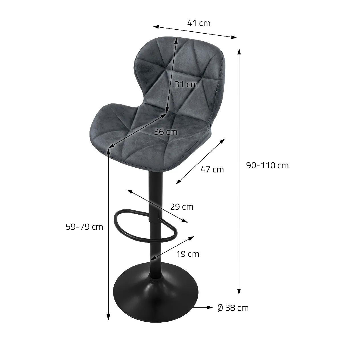 Le style moderne anthracite s'intègre aux cuisines et coins bar, et la quantité de 4 tabourets permet d'équiper un espace familial ou un coin réception d'un seul ensemble. La structure relevable favorise une montée et une descente contrôlées, et la capacité de charge de 120 kg convient à un usage quotidien. Les dimensions compactes (hauteur env. 90 cm, largeur 41 cm, profondeur 47 cm) facilitent l'aménagement, tout en conservant un appui stable grâce au reposepieds et au pied circulaire.