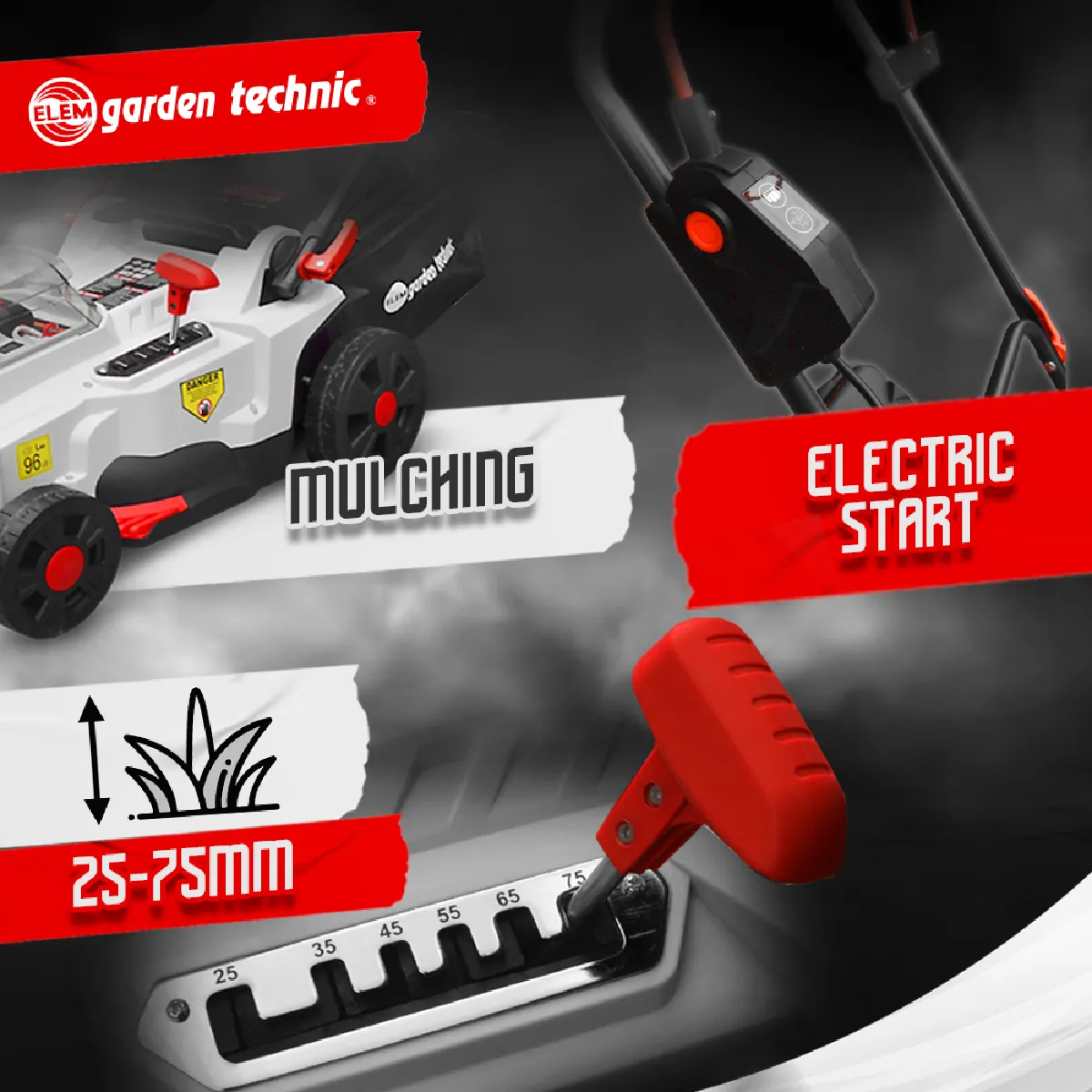 - Hauteur de coupe centralisée 6 positions (25-75 mm)