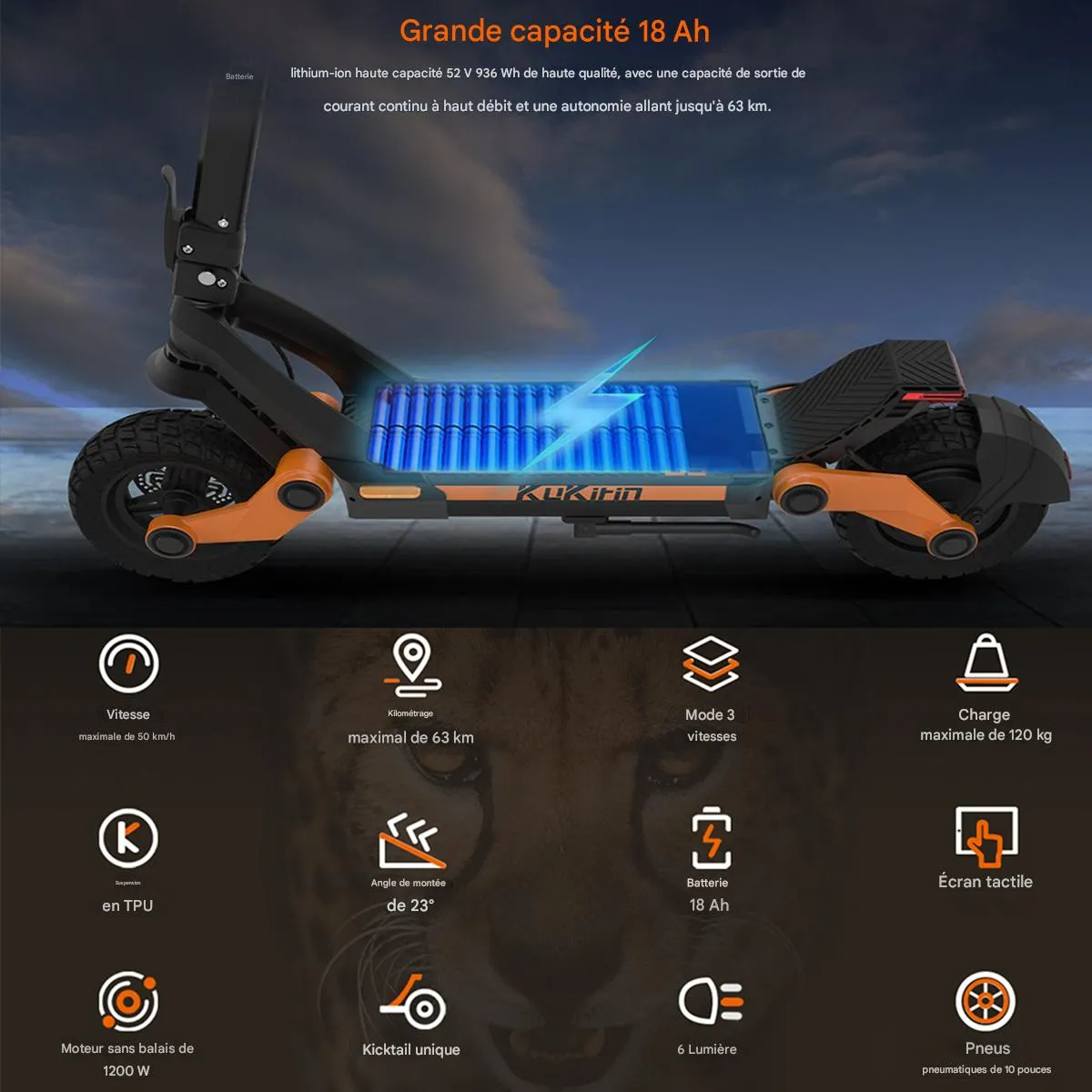 Le cadre est fabriqué en alliage d'aluminium à haute résistance et conçu d'une seule pièce sans soudures, solide et esthétique. Grâce à sa conception tout-en-un, le KuKirin G3 est plus résistant et plus durable, parfait pour vos sorties cross-country!Moteur puissant de 1 200 W