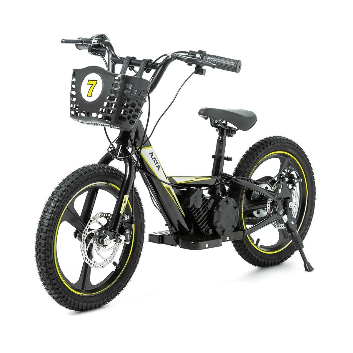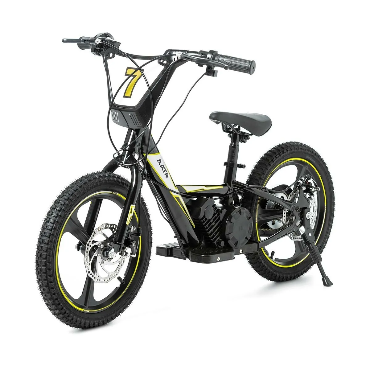 Mini E-Bike Sparkid 16' vélo électrique pour enfants avec batterie au lithium haute performance, 3 vitesses, moteur 100W et structure en alliage d'aluminiumAvec notre nouveau vélo électrique Sparkid 16 Mini, les enfants pourront facilement acquérir les compétences fondamentales nécessaires pour conduire un vélo et une moto. En effet, nos apprentis pilotes pourront acquérir la confiance nécessaire à la conduite sur 2 roues. Avec ce vélo alimenté par batterie, ils pourront entraîner et développer leurs capacités psychomotrices. Une fois les notions de base de poussée et d'équilibre acquises, ils pourront rouler en accélérant et en freinant. De plus, l'apprentissage est sûr et progressif. grâce aux 3 vitesses sélectionnables du vélo électrique Mini E-Bike Enfant Sparkid 16. Ce vélo électrique original pour enfant est équipé d'une puissante batterie lithium 24V 5,2 Ampères et d'un moteur de 250W lui permettant d'atteindre une vitesse allant jusqu'à 19 km /h (en fonction de plusieurs critères) et ils pourront limiter la puissance du vélo en fonction des capacités du petit pilote. C'est un vélo électrique durable avec un cadre en acier de qualité, des roues en caoutchouc de 16 pouces, une fourche de type BMX et une autonomie comprise entre 40 et 60 minutes, de quoi passer de bons moments et s'amuser avec vos enfants. Si vous cherchez à offrir quelque chose de différent, n'hésitez pas à acheter un vélo électrique Sparkid 16' Mini pour les petits passionnés de 2 roues, c'est la meilleure draisienne que vous puissiez trouver.Caractéristiques du vélo électrique Mini E-bike Sparkid 16 :Marque : ATAAModèle : Mini Sparkid 16'Batterie : lithium 24 V 5,2 AhMoteur : 250WCadre : AcierFourche avant : AcierGuidon : alliage d'aluminiumAssise : rembourrage en mousse de polyuréthane réglable en hauteur et tube en alliage d'aluminiumRoues : pneus en caoutchouc de 16 poucesJantes en alliage de magnésiumFrein : frein à disque avant et arrièreAccessoires de façade interchangeables, panier ou numéro décoratif inclusBéquilleIndicateur de batterie sur le guidonBouton de vitesseBouton d'alimentation sur le guidonAutonomie : 40-60 minutesChargeur : 24 V 1,5 AhVitesse : 8 km/h / 13 km/h / 20 km/hPoids du vélo électrique : 11,3 kgDimensions du vélo électrique Mini E-Bike Sparkid 16' :102*58*68cmDimensions min du sol à la selle : 45 cmDimensions max du sol à la selle : 51 cmPoids de charge maximum : 50 kgCe produit n'est pas un jouet, ne pas utiliser sur la voie publique, toujours utiliser sous la surveillance d'un adulte.Protégez vos enfants, portez-les avec des protections adaptées, comme un casque, des genouillères et des coudières.