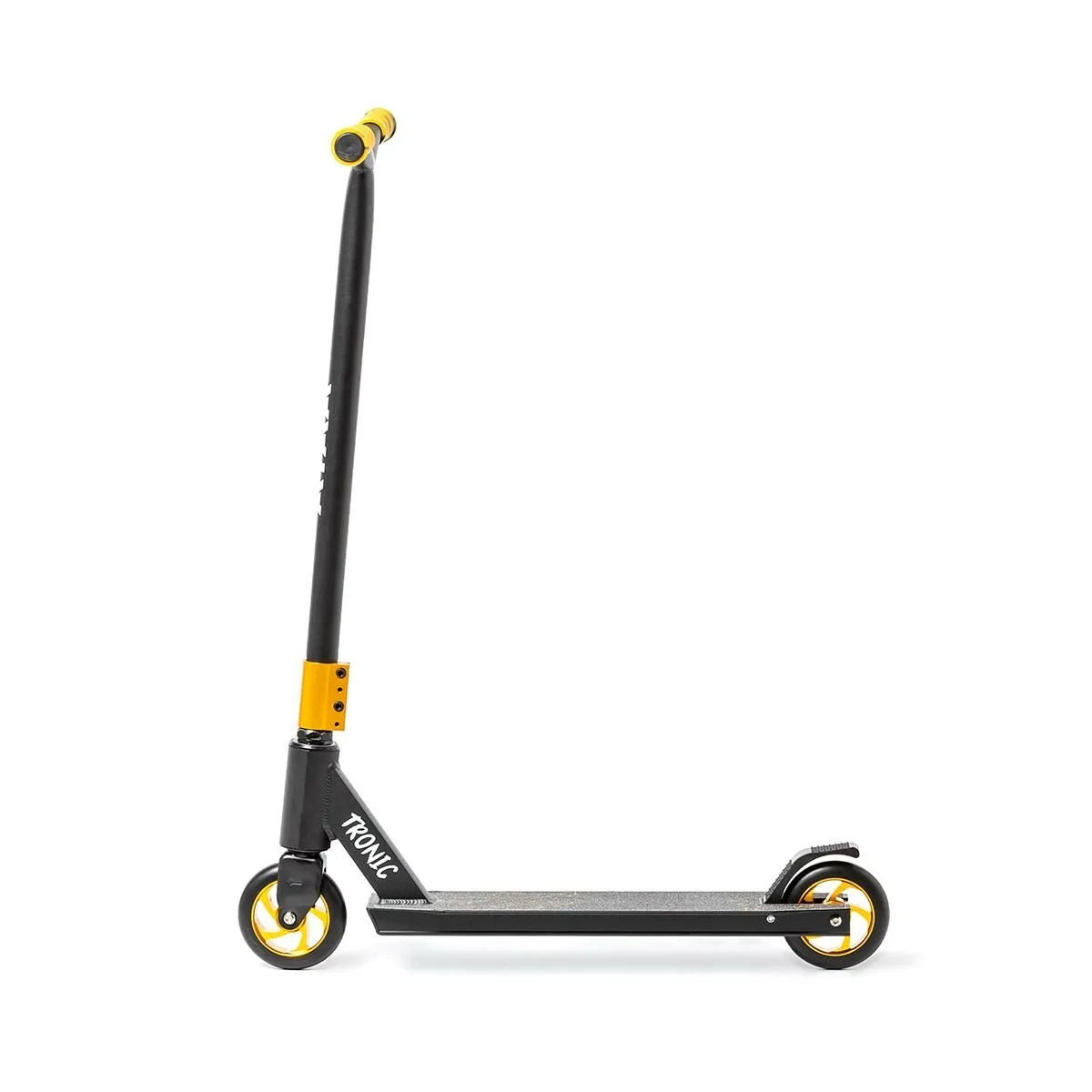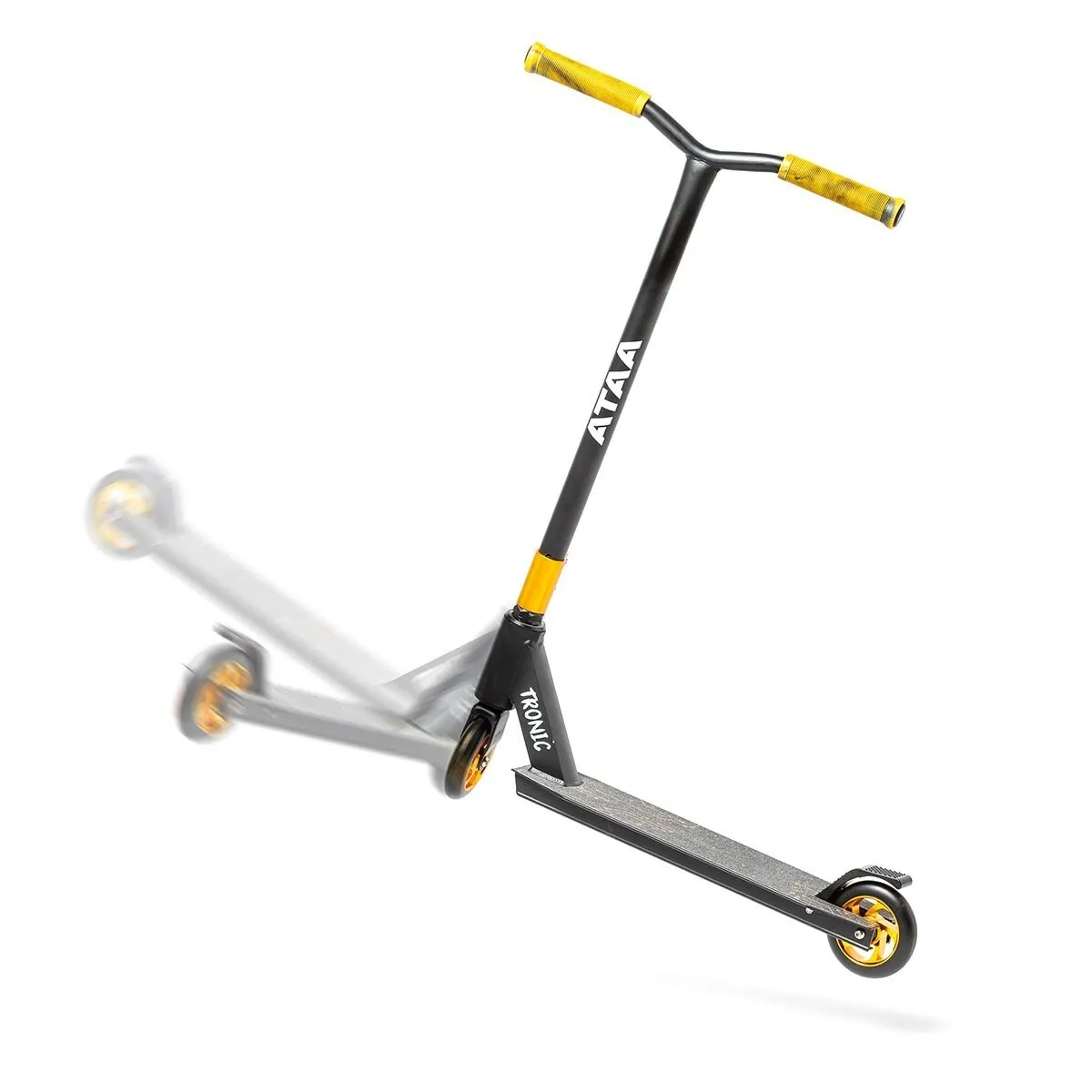 Trottinette freestyle Tronic avec roues de 110 mm et guidon en acier plus résistant.Que vous souhaitiez augmenter votre répertoire de tricks en trottinette ou que vous souhaitiez vous lancer dans le monde de la trottinette freestyle, la trottinette Tronic sera un excellent choix. La trottinette adulte Tronic est une trottinette urbaine unique pour les riders avec plus de personnalité. Son design de style industriel s'inspire des circuits imprimés, c'est une union parfaite entre tradition et avant-garde, ses couleurs sobres et audacieuses vous enchanteront à la fois. Mais ce n'est pas tout, la trottinette Freestyle Tronic est aussi unique de par ses caractéristiques et sa haute qualité en tant que trottinette, vous pourrez l'utiliser aussi bien pour vos déplacements en ville que pour vous entraîner au skatepark. Son guidon en forme de T est en acier très résistant, il est relié par 4 points de fixation donc il sera très difficile de le casser, il peut aussi pivoter à 360º, parfait pour faire des barspins. Sa plate-forme légère en aluminium avec un profil étroit réduit les frictions pour que vous puissiez capter plus d'accélération, qui, associée aux roues en PU de 110 mm plus résistantes avec un noyau radial en aluminium monté avec des roulements ABEC-9, plus fluides, vous permettront de prendre de la vitesse dont vous avez besoin avec moins de boost. C'est aussi la taille de roue parfaite pour avoir une bonne stabilité et un meilleur contrôle du frein arrière. La trottinette freestyle Tronic est sans aucun doute une trottinette urbaine pour les usagers de trottinettes réguliers qui veulent se démarquer des autres sans sacrifier les bonnes performances. Caractéristiques de la Trottinette Freestyle Adulte TRONIC :- Marque : ATAA- Modèle : TRONIC- Design réalisé en Europe- Guidon en acier- Guidon avec poignée grip en gomme- Plate-forme en aluminium- Fourche en acier monobloc.- Roues en PU de 110 mm avec radial en aluminium CORE- Dureté des roues 82A- Roulement ABEC-9.- Pédale de frein arrière.- Plate-forme antidérapante.- Guidon avec 4 points de fixation.- Poids maximal : 100 kg.- Poids du scooter : 3,5 kg.- Dimensions de la trottinette : 65 ( longueur totale ) x 46 ( largeur guidon ) x 85 (hauteur totale) cm- Certificats CE.ATAA vous recommande de porter un équipement de protection adéquat pour la conduite d'un scooter (casque, genouillères et coudières).La plupart des accidents surviennent durant les premiers mois de pratique : nous vous conseillons de prendre votre temps pour apprendre à manier la trottinette et à maîtriser vitesse et freinage en cas d'urgence et par tous les temps (surtout sur sol mouillé).