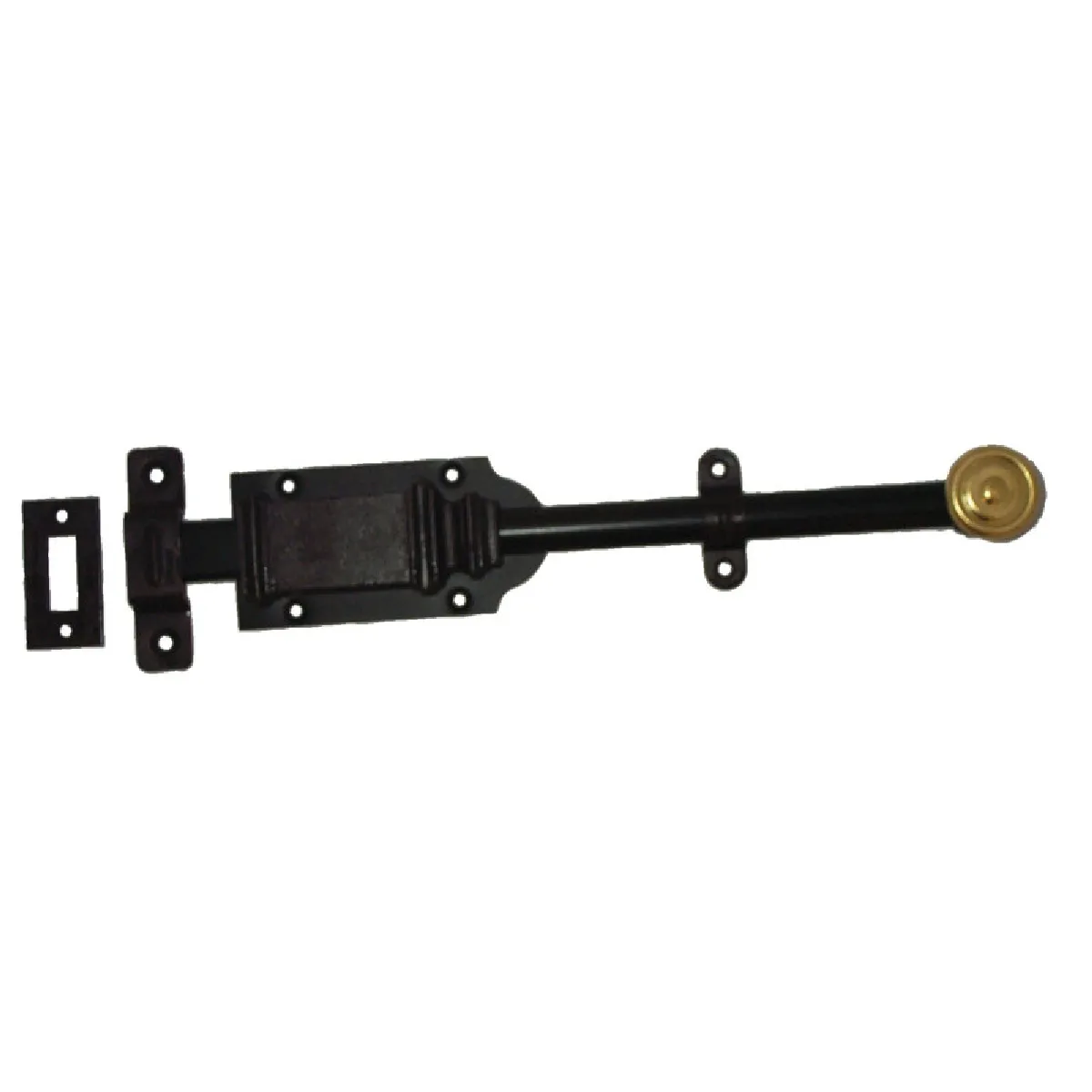 Verrou en fonte avec bouton laiton.- Largeur de la tige : 16 x 6 mm.- Platine de 55 x 110 mm.