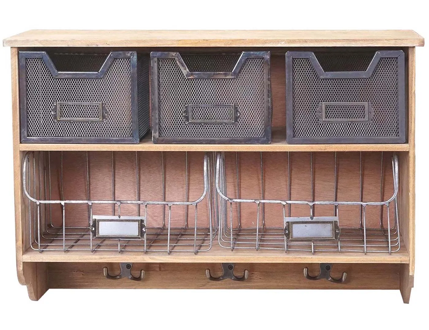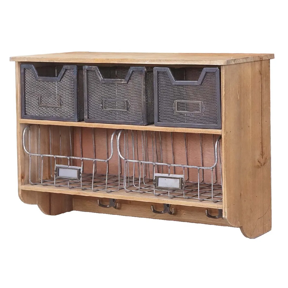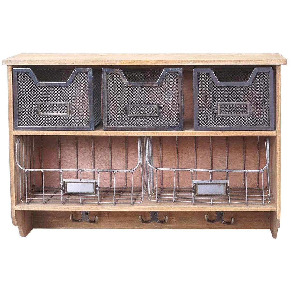 Optimise l'entrée avec une solution murale qui combine étagère ouverte et rangements à tiroirs. Le vestiaire MENDLER en finition marron regroupe 3 petits et 2 grands tiroirs pour classer gants, clés ou accessoires, tandis que les crochets en métal accueillent vestes et sacs. La structure associe bois de paulownia, cadre en bois de sapin et MDF pour un rendu vintage patchwork. Le format mural 42 x 60 x 24 cm libère le sol et s'adapte aux couloirs étroits. Le style shabby chic, rehaussé d'une surface brossée au caractère unique, apporte une note décorative sans compromettre la fonctionnalité.