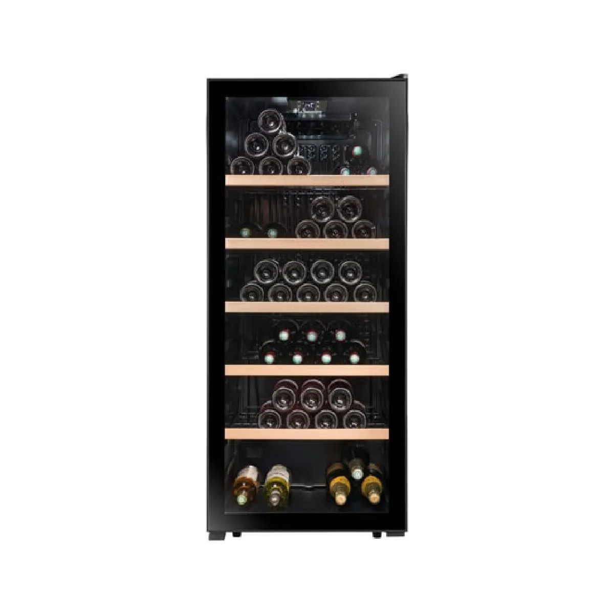 La capacité de 121 bouteilles s'appuie sur 5 clayettes fixes en fil d'acier, chacune dotée d'un fronton en hêtre pour un repérage clair et un rendu visuel soigné. La porte vitrée mettant en valeur votre sélection permet de visualiser le contenu d'un coup d'il. Le format pose libre s'intègre facilement dans différents espaces, avec deux pieds réglables pour un niveau parfait et deux roulettes pour les déplacements courts lors de l'installation ou du ménage. Sans affichage de température intégré, l'usage reste épuré et direct, adapté à une mise en service simple au quotidien.