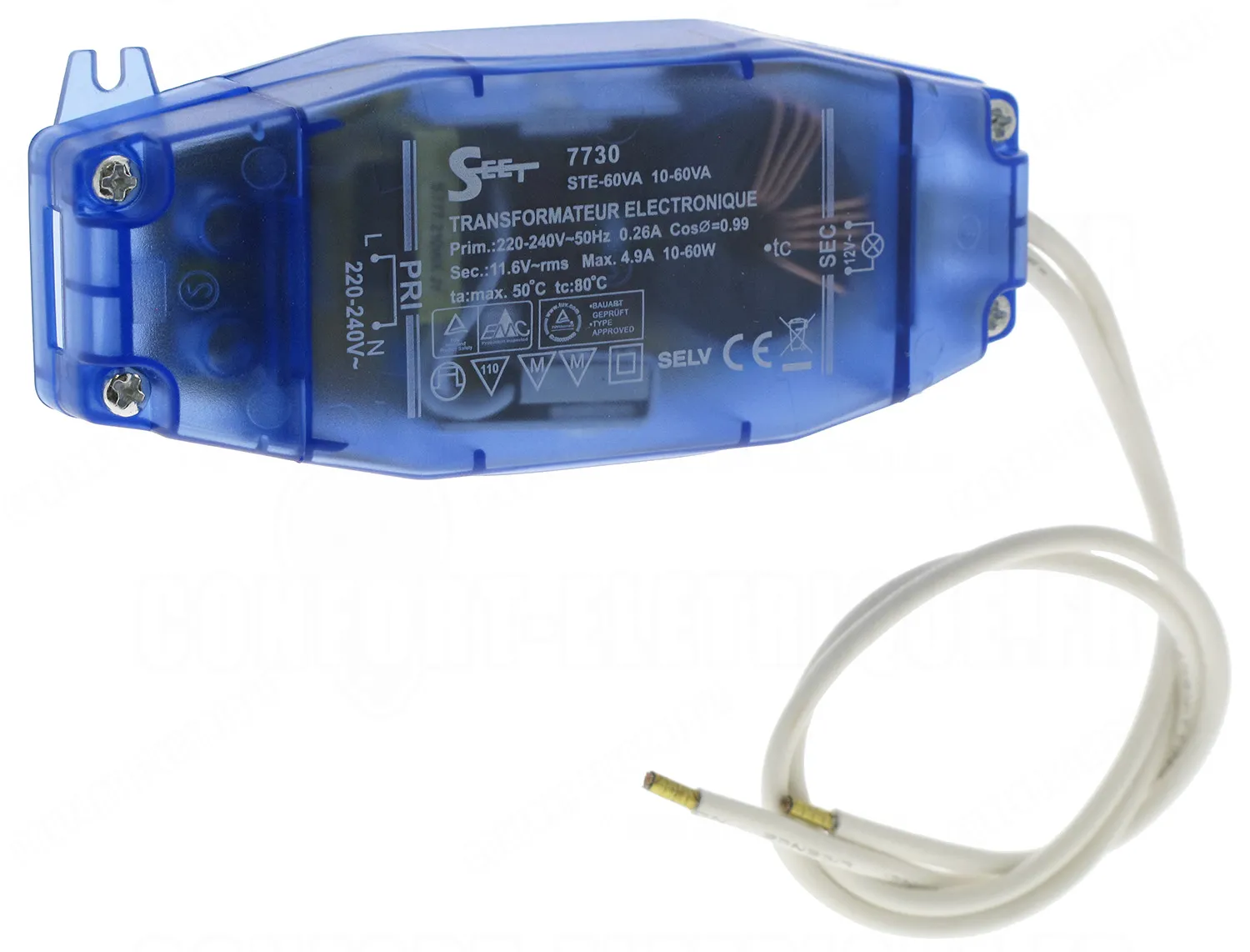 Transformateur électronique 230V?12V - Plage 10–60VA - IP20 - Câble sortie 30 cm - Réf. STE-60VA