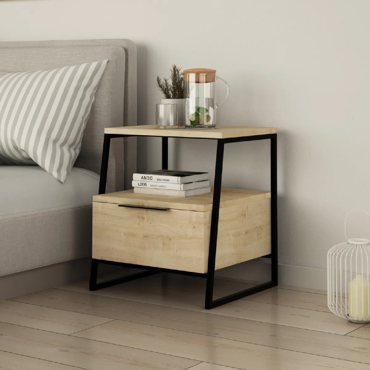 Découvrez la table de chevet au style industriel qui apportera une touche moderne à votre chambre. Avec sa combinaison de chêne et de noir, elle incarne l'esthétique robuste et élégante de l'industrie. Fabriquée à partir de panneaux de particules 100% mélaminés et de métal, elle offre durabilité et stabilité. Dotée d'un tiroir et d'une étagère, elle vous permet d'organiser vos objets essentiels de manière pratique. Son système d'ouverture par porte abattante ajoute une touche de fonctionnalité. Avec ses deux pieds, elle se démarque par son design épuré et moderne. Ajoutez-la à votre chambre pour une ambiance industrielle et tendance.