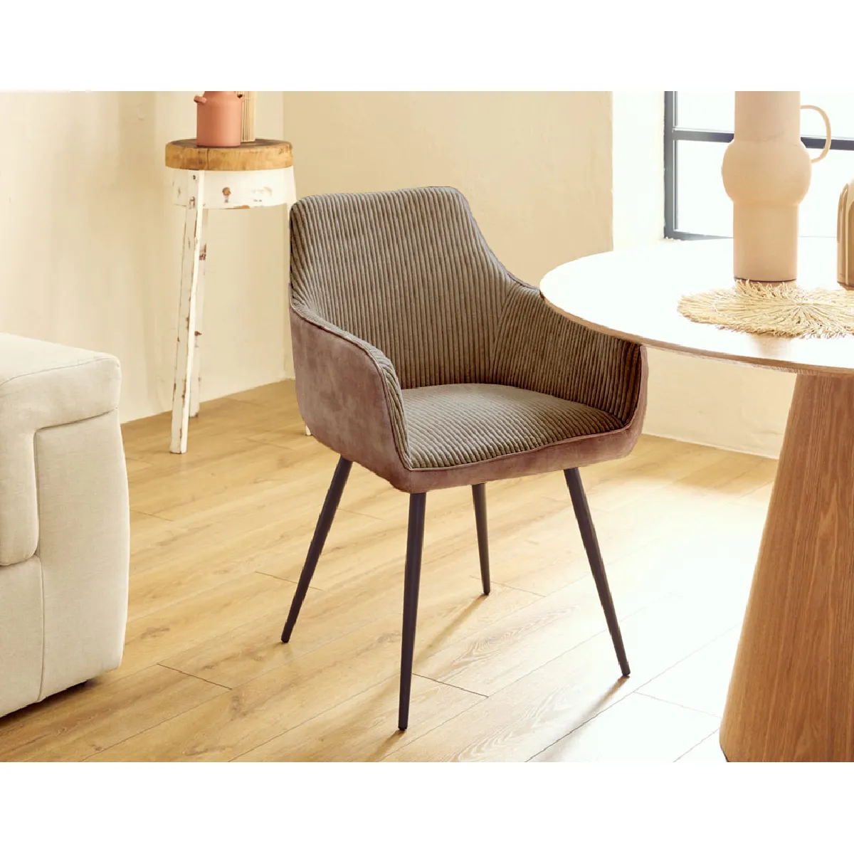 - Présentation de la collection : Découvrez les fauteuils Lormi en velours côtelé et simple, disponibles en plusieurs coloris. Faciles à monter et parfaits avec nos tables, ils allient confort et élégance.