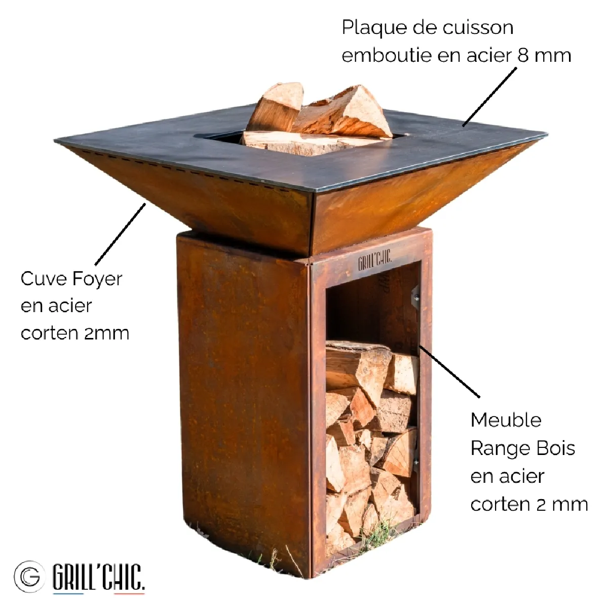 Braséro plancha avec range-bois - Acier corten - Finition rouille - 74 x 74 x 90 cm