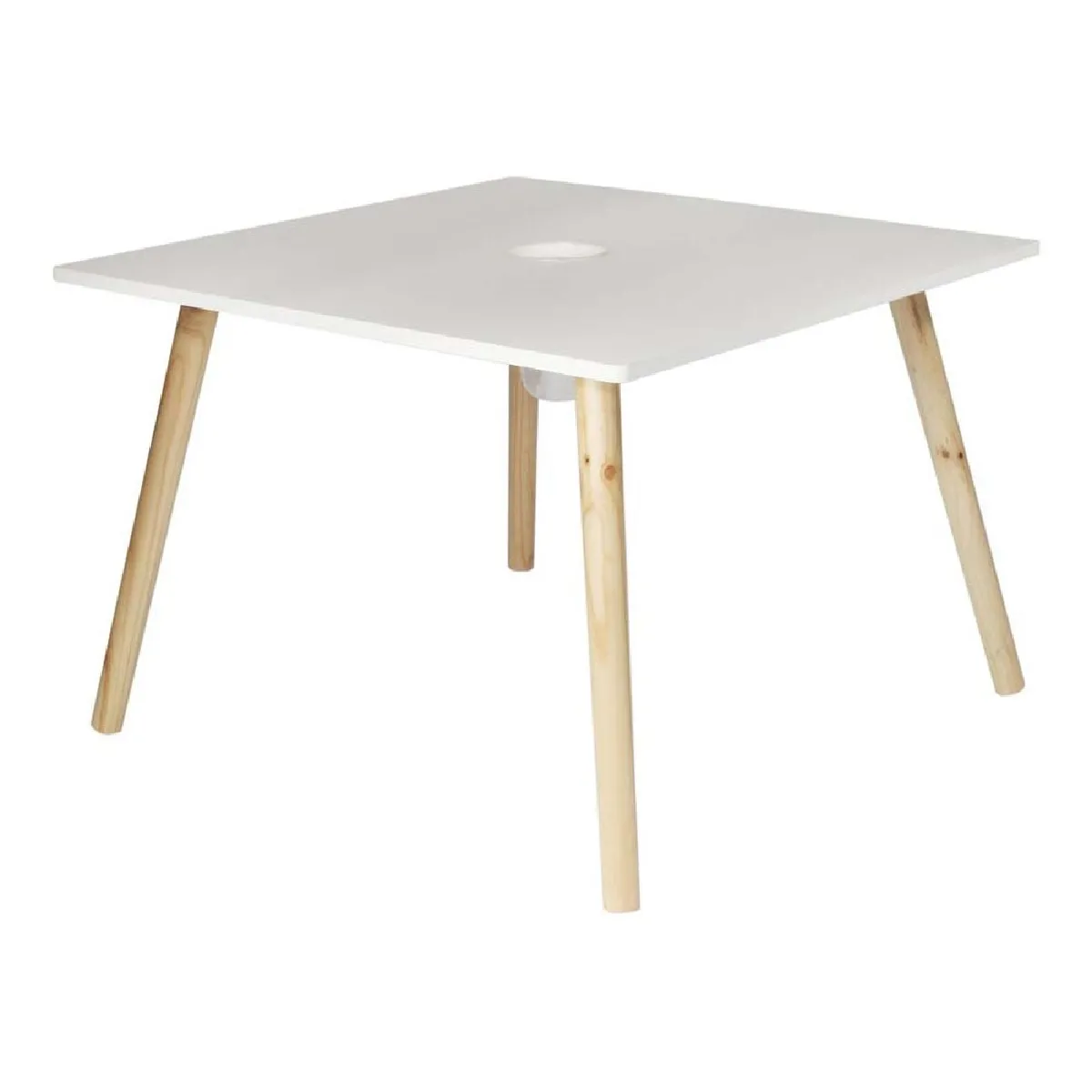 Le plateau carré de 60 x 60 cm offre une surface utilisable bien proportionnée pour le dessin, les puzzles et les petites constructions. Le pot à crayons intégré aide les enfants à organiser stylos et gommes, évitant qu'ils roulent sur la table et libérant l'espace de travail. Avec une structure en MDF et pieds en pin, l'ensemble combine rigidité du plateau et ancrage au sol, pour un usage régulier dans une chambre ou une salle de jeux.