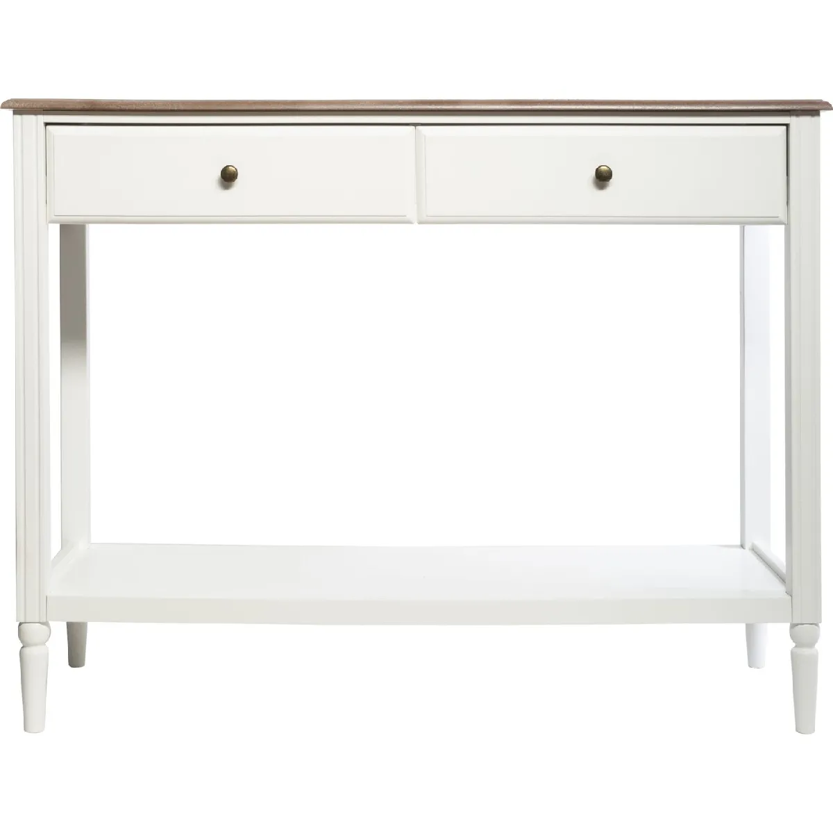 Commentaire vendeur : Succombez au charme de cette console à l'aspect authentique et chaleureuse. Idéale pour créer une ambiance douce et romantique, vous serez séduit par sa structure effet bois et ses poignées coloris laiton effet vieilli.FICHE TECHNIQUE- Structure de la console en MDF.- Placage en bois de frêne.- Pieds en bois de pin.- Ses tiroirs vous offriront un bel espace de rangement pour ranger vos affaires.CARACTERISTIQUES TECHNIQUES- Dimensions : L. 110 x l. 40 x H. 85 cm.- Dimensions des tiroirs : L. 44 x l. 28,5 x H. 6 cm.- Hauteur entre dessus et étagère : H. 65 cm.- Hauteur entre sol et étagère : H. 18,5 cm.- Poids : 21,9 kg.