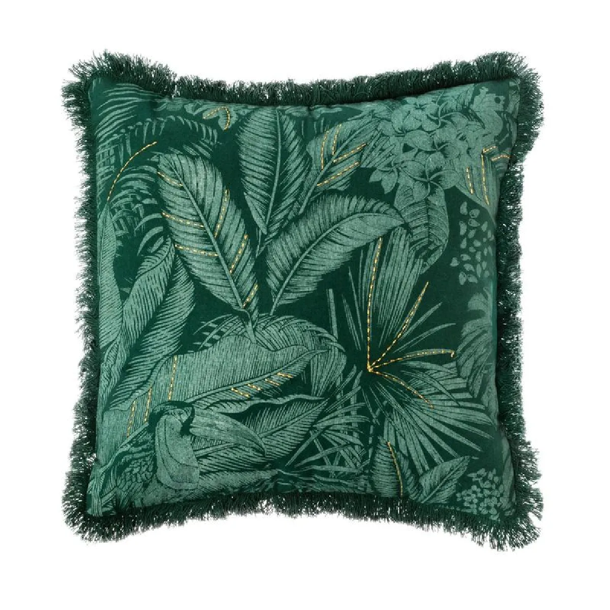 Avec son esprit Art déco, cette housse de coussin vertea tout pour plaire. Elle est décorée de fleurs dans des tons plus clairs, tandis que des fils brillants ornent certaines parties. Sur les bordures, de fines franges ajoutent une note originale. Vous pourrez facilement l'associer à un canapé en tissu gris, blanc ou même noir.