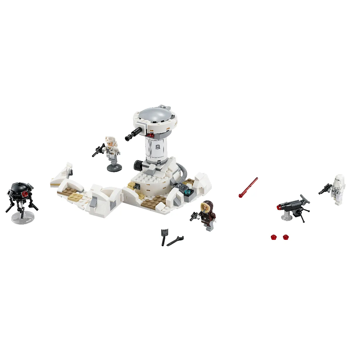 Comprend une base Echo à déplier avec une tour rotative avec une trappe qui s'ouvre et un missile, une tranchée, un droïde sonde impérial et un fusil à tenons impérial.