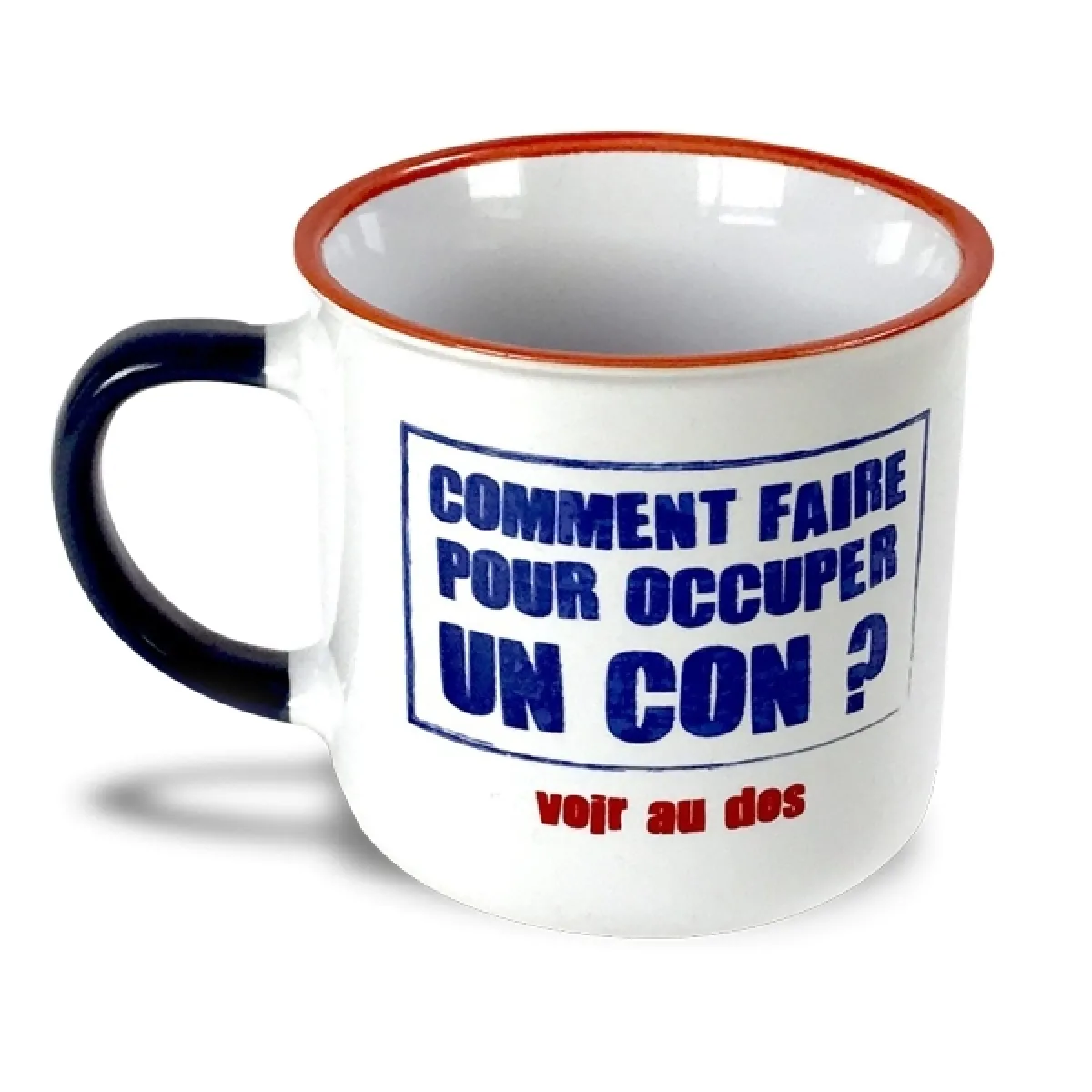 Une bonne dose d'humour de votre part a toujours fait du bien à vos collègues ? Cette fois-ci, penchez pour cette magnifique tasse en céramique avec l'inscription " comment occuper un con, voir au dos" qui provoquera certainement des sourires.* Passage au lave-vaisselle et au micro-ondes toléré