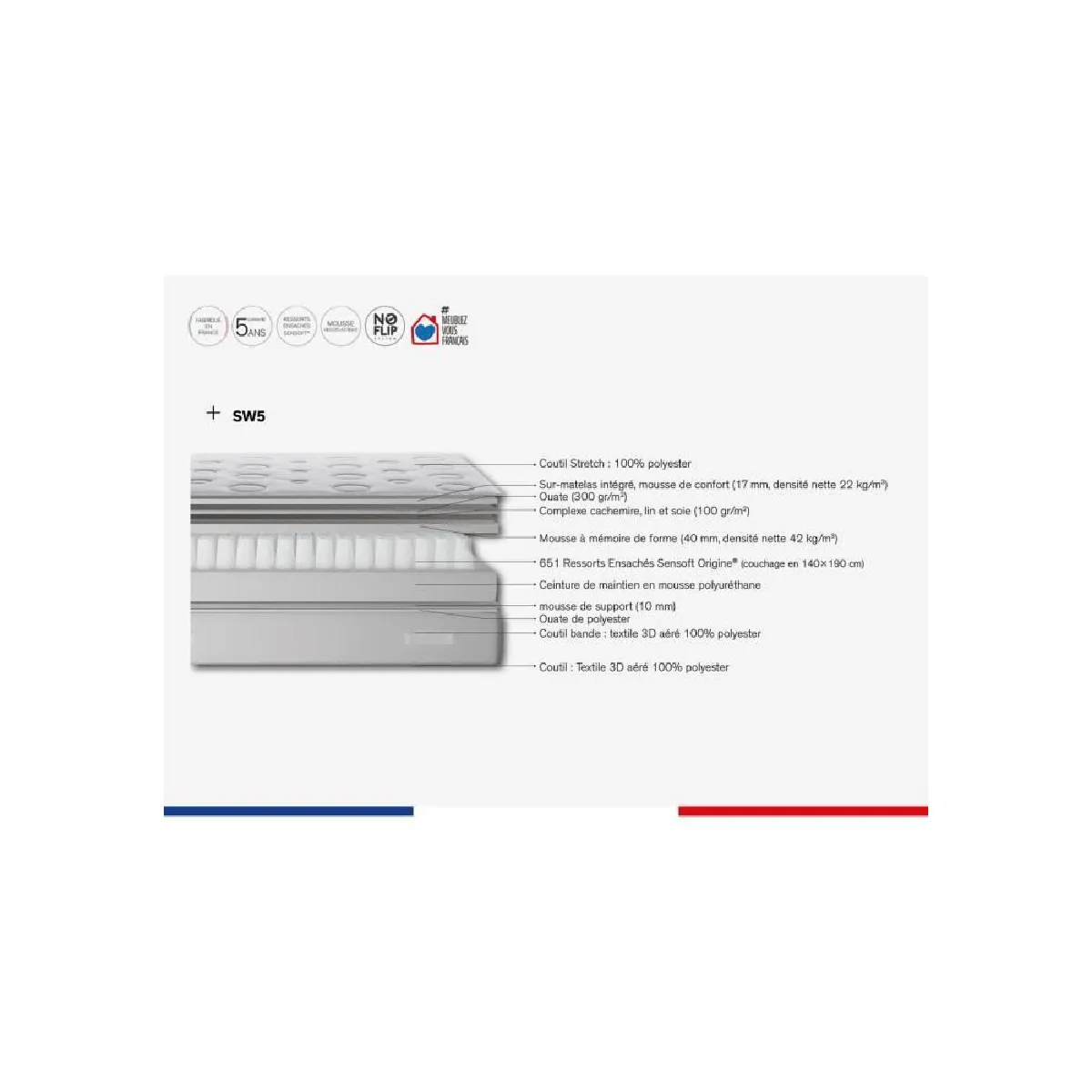 - Matelas Simmons SW5 + surmatelas intégré :- Technologie : Suspension ressorts ensachés Sensoft Origine (651 pour la dimension 140x190cm)- Ceinture de maintien en mousse polyuréthane- Hauteur totale : 29 cm- Double face de couchage : non- Système No Flip- Face de confort : Sur-matelas mousse à mémoire de forme intégré + complexe cachemire, soie et lin + mousse de confort + ouate.- Face technique: Ouate (150 gr/m2) et mousse de support + coutil aéré 100% polyester.- Poignée(s) : 4- Composition coutil : stretch 100% polyester- Fabriqué en France- Sommier tapissier SIMMONS SW + pieds :- Suspension : 13 lattes en longueur 190cm et 14 lattes en longueur 200cm.- Type de lattes :lattes passives en bois massif - Structure en bois massif- Barre centrale de renfort (à partir de largeur 140cm).- Tissu : coutil aéré 100% polyester- Toile de fond anti poussière : oui- 4 masses d'angle pour pieds filetage 8mm.- Peut être inséré dans un lit ou mis sur pieds- Fabrication française- Jeu de 4 pieds PVC coloris acier brillant hauteur 8cm offerts.- En dimension 160/2x80x200, l'ensemble Simmons SW5 ressorts ensachés est constitué d'un matelas 160x200 et de 2 sommiers 80x200. - En dimension 180/2x90x200, l'ensemble Simmons SW5 ressorts ensachés est constitué d'un matelas 180x200 et de 2 sommiers 90x200.