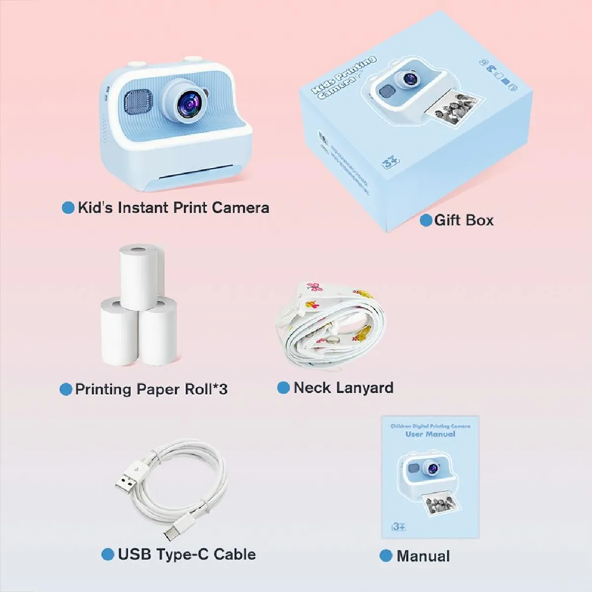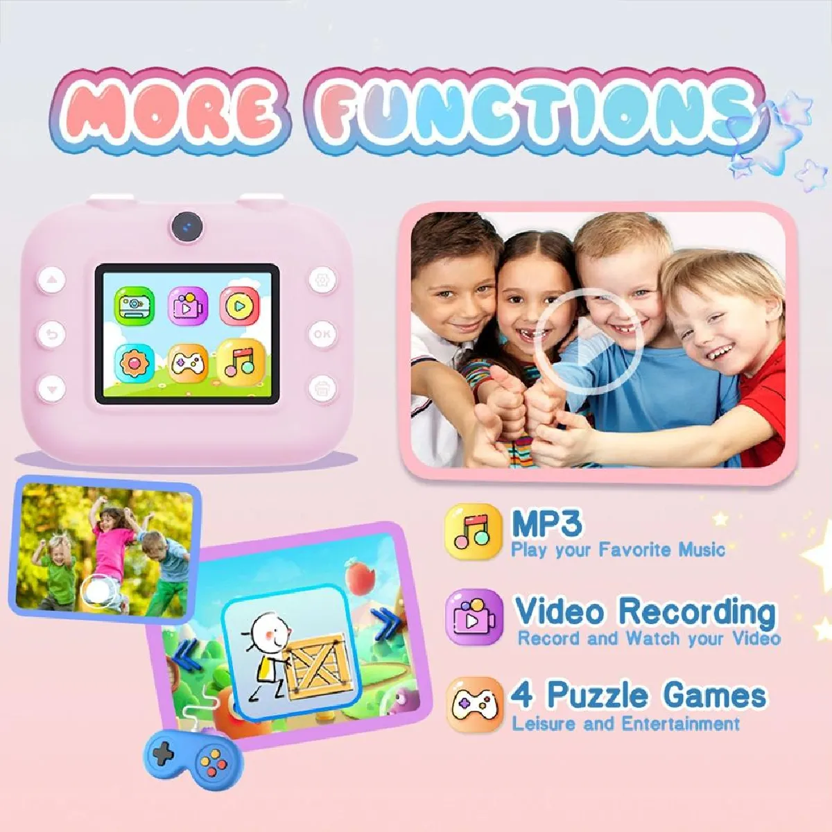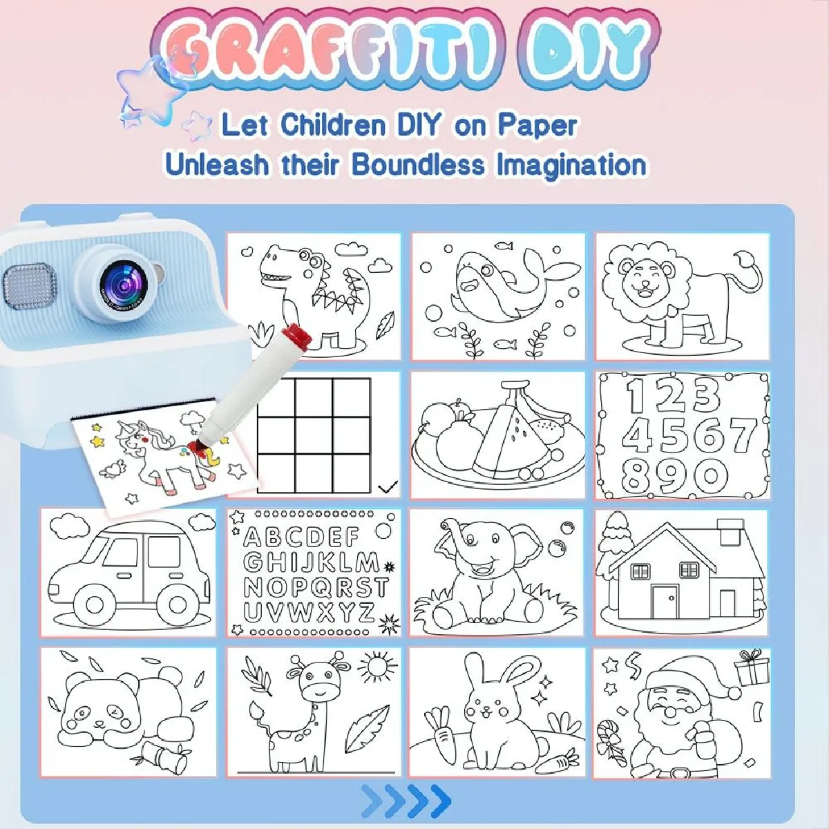 Appareil Photo Enfant avec écran 2.4 pouces et double caméra 1080P HD. Capturez des moments inoubliables avec des photos de haute qualité et des vidéos en 1080P. Ce modèle ludique et robuste est parfait pour les jeunes photographes en herbe, offrant une utilisation facile et des jeux intégrés pour plus de fun. Fonction d'impression thermique pour des souvenirs instantanés.