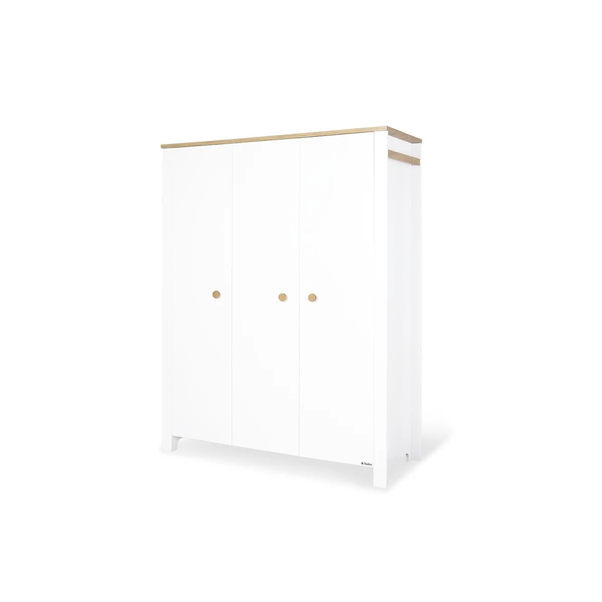 L'organisation du dressing de votre enfant gagne en clarté grâce à une capacité bien structurée et facile d'accès. Cette armoire à 3 portes propose un aménagement modulable avec étagères réglables et penderie pour accompagner l'évolution des besoins. Les portes dotées du système Soft-Close réduisent le bruit et protègent les doigts lors de la fermeture. Le décor blanc uni s'associe à des éléments chêne à structure bois véritable harmonieuse et durable, pour une présence discrète dans la chambre. Les dimensions 146 x 54 x 190 cm offrent un espace de rangement généreux tout en restant adaptées aux pièces d'enfant.