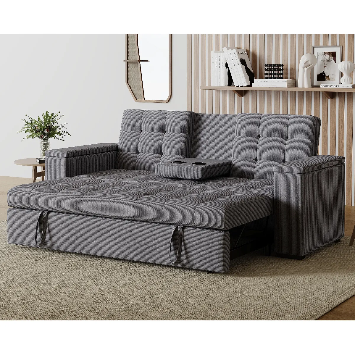 Canapé convertible modulable velours gris - 3 places, accoudoirs rangement