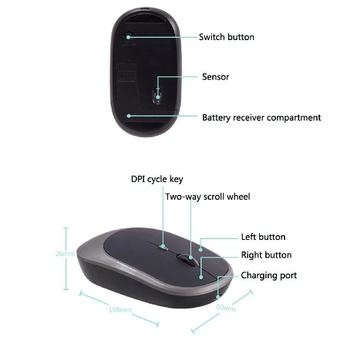 - Dimensions : 108 x 60 x 26mm