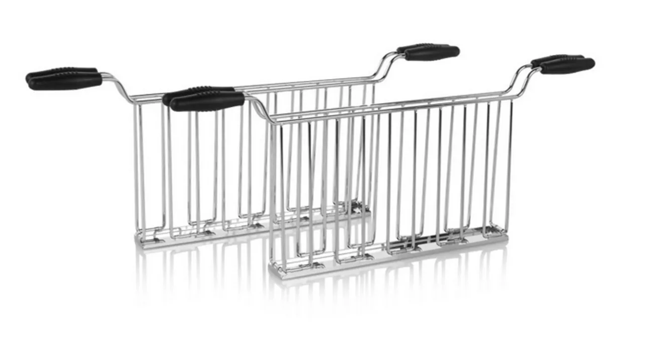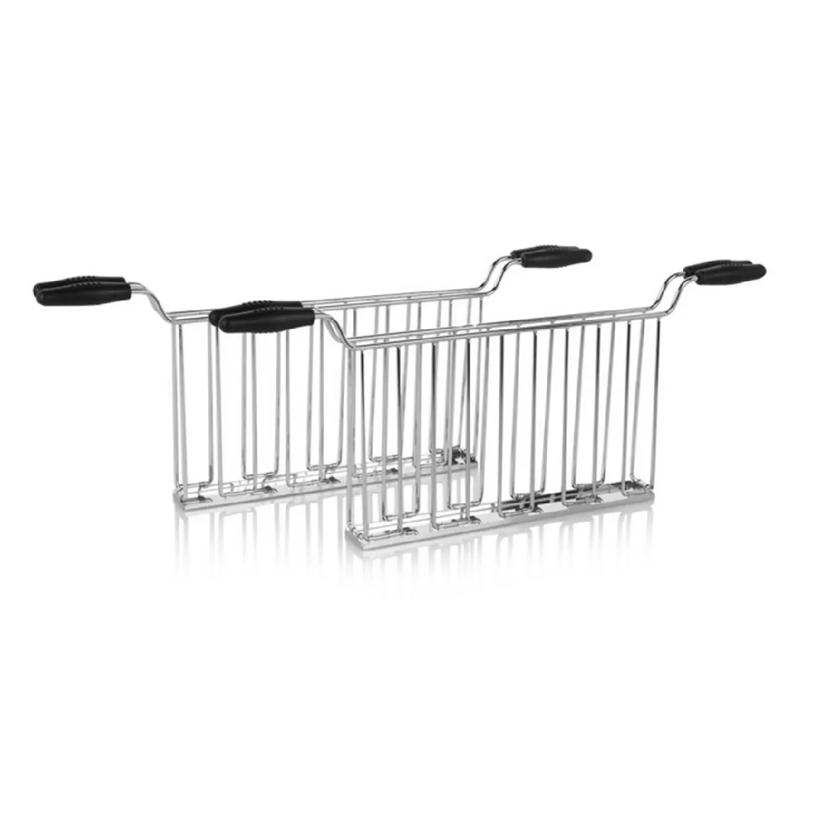 Chaque pince est réalisée en acier inoxydable avec base et grilles en acier, assurant une bonne rigidité et une tenue régulière des tranches. Les poignées en plastique résistantes à la chaleur favorisent une prise confortable et réduisent le risque d'échauffement lors du retrait. La compatibilité dédiée avec le grille-pain 4 tranches TSF02 garantit une insertion fluide et un maintien optimal à l'intérieur des fentes. Grâce au guidage du cadre, le pain reste centré, ce qui aide à obtenir un grillage homogène des deux côtés.