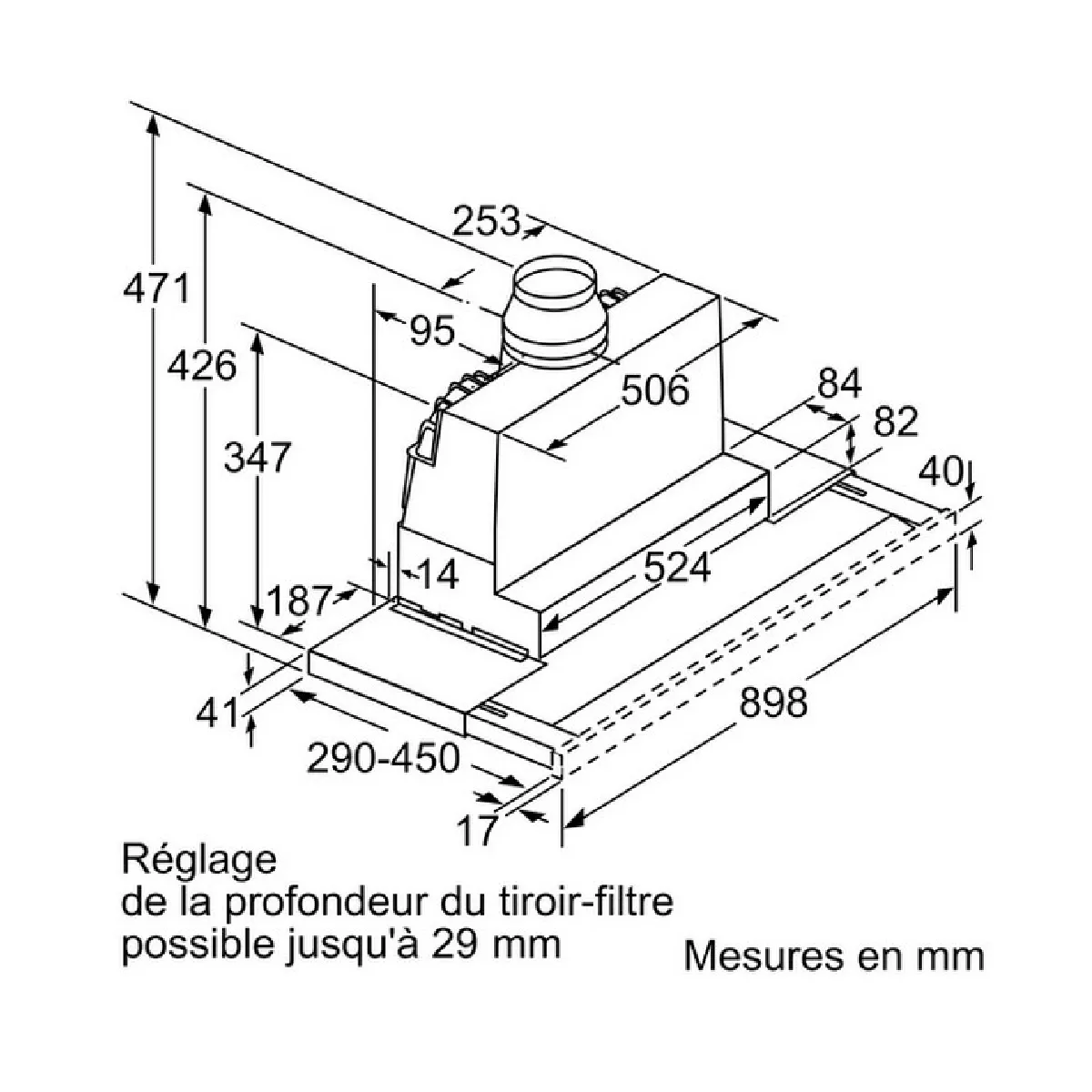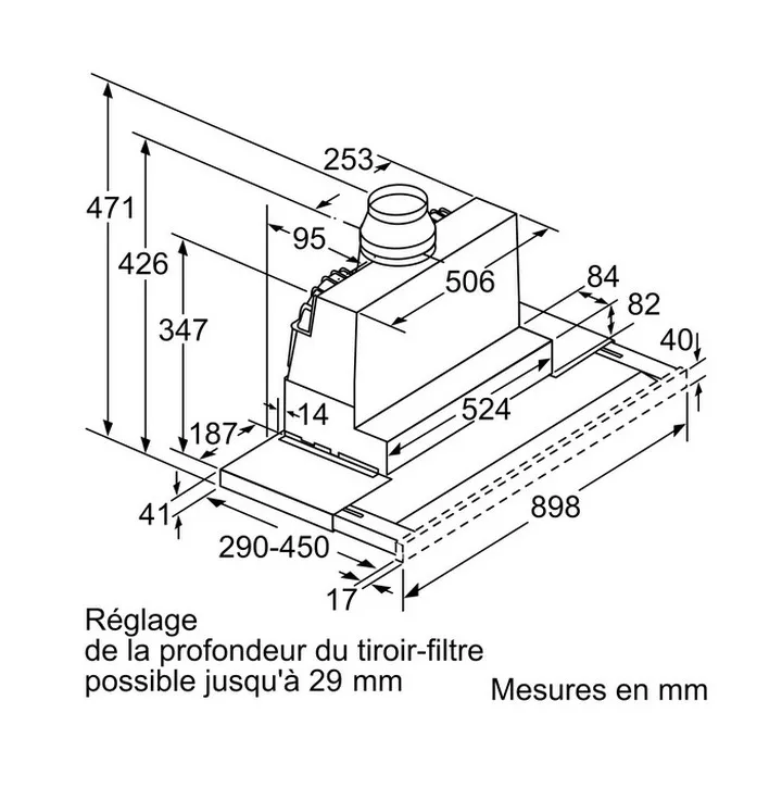 - Type : hotte télescopique encastrable, largeur 90 cm